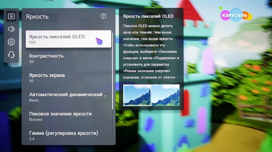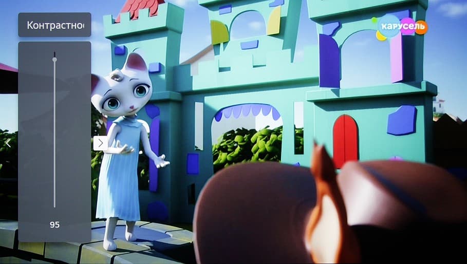 Непосредственно при регулировке параметров изображения на экран выводится уже только название настройки, ползунок и текущее значение или список вариантов, что облегчает оценку влияния этой настройки на изображение, при этом настройки перебираются экранными кнопками вправо и влево.