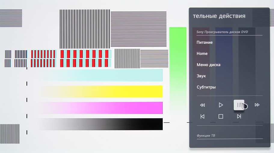 Кинотеатральные режимы работы тестировались при подключении к плееру Ultra HD Blu-ray Sony UBP-X700 . Использовалось HDMI-подключение. В случае данного источника телевизор поддерживает режимы 480i/p, 576i/p, 720p, 1080i и 1080p при 50/60 Гц, а также 1080p и 4К при 24 Гц (о поддерживаемых режимах при подключении к ПК рассказано ниже). Подстройка частоты обновления под частоту кадров в сигнале работает, поэтому, например, в случае режима 1080p при 24 кадр/с кадры выводятся с равной длительностью. Цвета правильные, с учетом типа видеосигнала яркостная и цветовая четкость высокая. В стандартном для видео диапазоне (16—235) отображаются почти все градации оттенков (завалом на один оттенок в светах можно пренебречь).