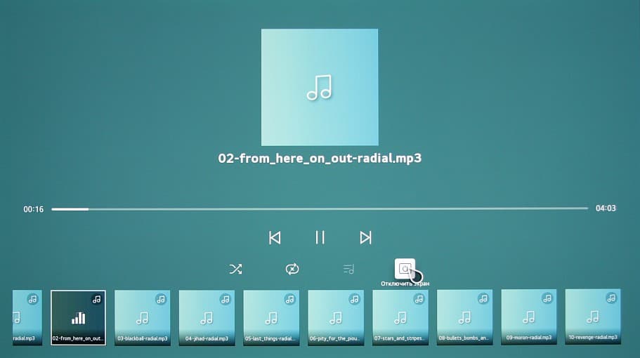В случае аудиофайлов поддерживаются множество распространенных и не очень форматов, как минимум AAC, MP3, OGG, WMA (в т. ч. lossless и 24 бит), M4A, WAV и FLAC (расширение должно быть именно FLAC). Поддерживаются тэги как минимум в MP3 и OGG, картинки-обложки в MP3 и тексты песен в тех же MP3. Экран ТВ можно отключить на время воспроизведения аудиофайлов.