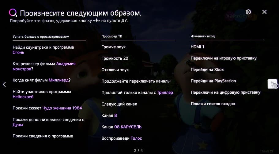 Для работы голосового управления требуется подключение к интернету и согласие пользователя на работу соответствующей службы. Голосовое управление работает хорошо, если знать, что именно говорить. На фразы, нераспознанные как команды, запускается поиск, и в его результатах будут видеоролики с YouTube и контент (фильмы), предоставляемый предустановленными программами. Голосовой ввод строки поиска также работает в некоторых программах, например в YouTube. Дополнительно телевизор умеет отвечать на некоторые типичные вопросы, например, про погоду.