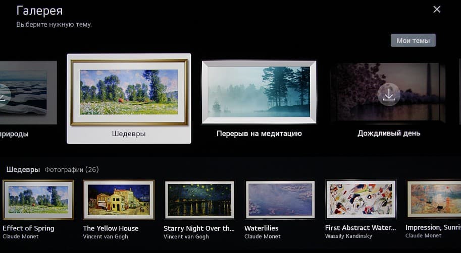 Среди предустановленных приложений есть приложение Галерея, превращающее телевизор в картину со сменным оформлением рамы и содержимого, а также с тематической фоновой музыкой (ее можно отключить). Благодаря свойствам матрицы OLED эти картины (статические или динамические) смотрятся великолепно.