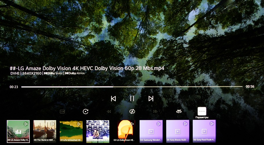 При поверхностном тестировании воспроизведения мультимедийного контента мы ограничились рядом файлов, запускаемых в основном с внешних USB-носителей. Источниками мультимедийного контента также могут быть серверы UPnP (DLNA). Были опробованы жесткие диски, внешние SSD и обычные флешки. Два протестированных жестких диска работали от любого из USB-портов, а в режиме ожидания самого ТВ или после некоторого периода отсутствия обращения к ним жесткие диски отключались. Отметим, что телевизор поддерживает USB-накопители с файловыми системами FAT32, exFAT и NTFS, а с кириллическими названиями файлов и папок не было никаких проблем. Плеер телевизора обнаруживает все файлы в папках, даже если на диске очень много файлов (более 100 тысяч). Нами подтверждена способность телевизора показывать растровые графические файлы в форматах JPEG, PNG и BMP, в том числе в виде слайд-шоу под фоновую музыку. Изображения JPEG и PNG размером 3840×2160 пикселей выводятся один к одному по пикселям в истинном разрешении 4К и даже без снижения цветовой четкости. Присутствуют функция поворота изображения с шагом 90 градусов и режим просмотра панорамных изображений 360 градусов.