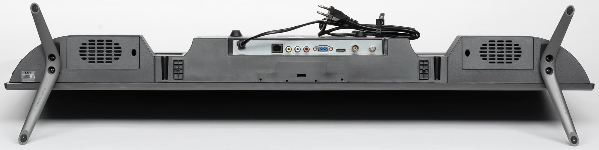Задняя панель условно в верхней части изготовлена из тонкого листа стали и имеет стойкое черное матовое покрытие. Выступающий назад кожух в нижней-центральной части с заходом на нижний торец изготовлен из черного пластика с матовой поверхностью. На этом кожухе сверху и сзади есть вентиляционные решетки. Интерфейсные разъемы размещены в двух незамкнутых нишах. Часть разъемов направлена вниз, часть вбок. Спереди дотягиваться до разъемов, направленных вбок, например, до разъема для наушников далеко, но относительно удобно. Кабели от этих разъемов можно вывести вниз даже если телевизор плотно прижат к стене, так как ниже есть подходящее углубление. Подключать кабели к разъемам, направленным вниз, также несложно, так как кабели не приходится выгибать, и их спокойно можно пустить вниз. Тонким телевизор назвать сложно.