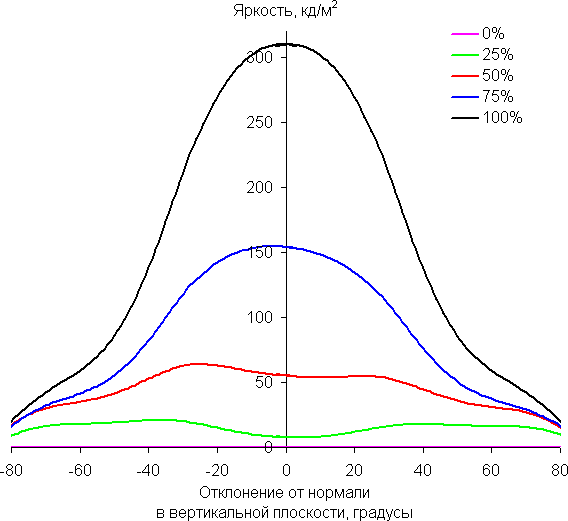 Отметим плавное уменьшение яркости при отклонении от перпендикуляра к экрану во всех трех направлениях. Под очень большими углами графики яркости некоторых полутонов пересекаются, то есть яркость оттенков инвертируется, но в реальной ситуации этого видно не будет. Яркость черного поля при отклонении от перпендикуляра к экрану возрастает, но всего до примерно 0,2% от максимальной яркости белого поля. Это хороший результат. Контрастность в диапазоне углов ±82° не опускается ниже отметки 10:1.