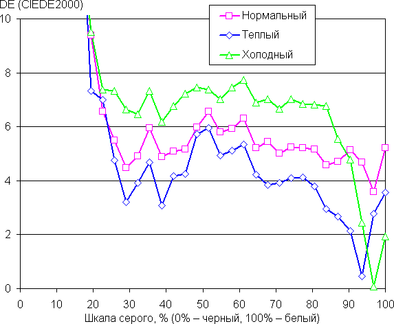 Самый близкий к черному диапазон можно не учитывать, так как в нем цветопередача не так важна, а погрешность измерения цветовых характеристик высокая. Цветовой баланс даже при выборе профиля Теплый далек от стандартного, так как на большей части шкалы серого цветовая температура высоковата, но в принципе, если отсутствует эталон для сравнения, то особого отвращения картинка не вызывает.