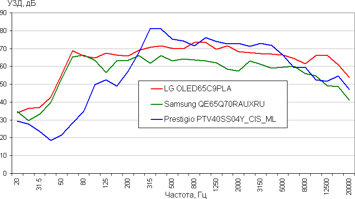Громкость встроенной акустической системы для жилой комнаты, соответствующей по размерам данной диагонали экрана, достаточная, есть даже большой запас. Стереофонический эффект выражен, но не очень отчетливо. Присутствуют высокие и средние частоты, низких — нет. Явно есть паразитные резонансы корпуса, однако выраженного дребезжания нет даже на максимальной громкости. Звук неприятный, резковатый. В целом даже с учетом класса встроенной в телевизор акустики ее качество ниже среднего. Сравним АЧХ этого ТВ с АЧХ двух телевизоров высшего класса: