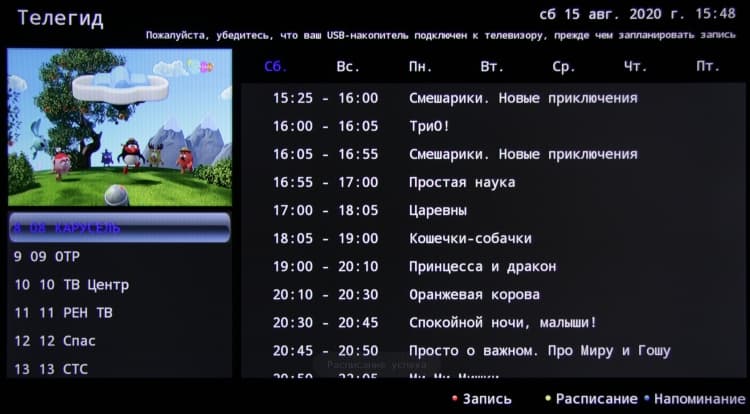 Есть хорошая поддержка электронной программы передач — можно посмотреть, что именно идет на текущем и других каналах, запрограммировать просмотр или запись программы или сериала и т. д.