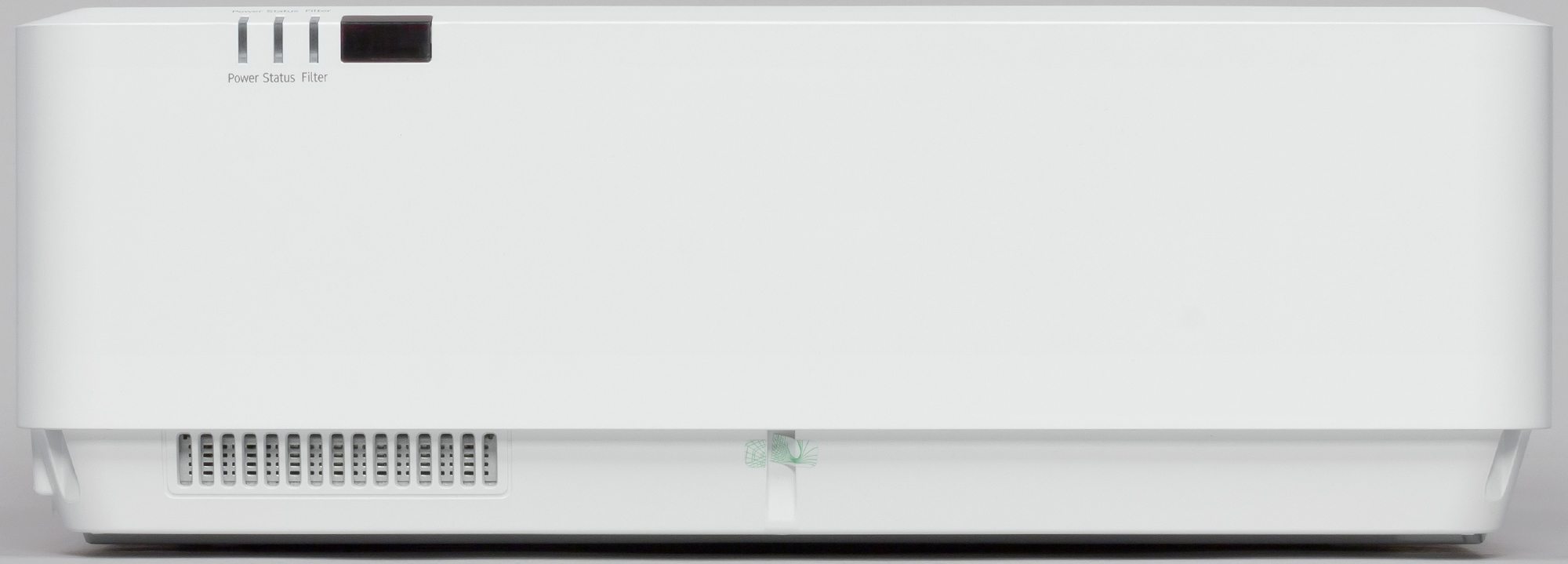 Также на днище можно увидеть глубокую нишу, образующую ручку для переноски проектора одной рукой, и две неглубокие ниши с ребрами, облегчающие транспортировку проектора двумя руками. Упакован проектор в большую и скромно оформленную коробку из гофрокартона.