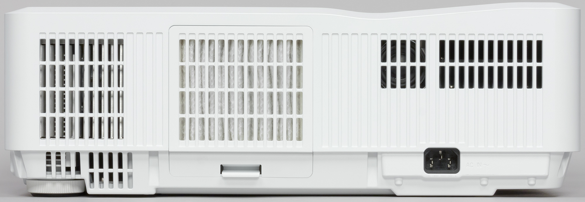На правом боку — выпускная вентиляционная решетка, за которой можно рассмотреть два больших вентилятора, решетка второго громкоговорителя и панель управления. На стыке днища и правого бока ближе к задней части есть перемычка в нише, за которую проектор можно пристегнуть к чему-то массивному, чтобы не украли.