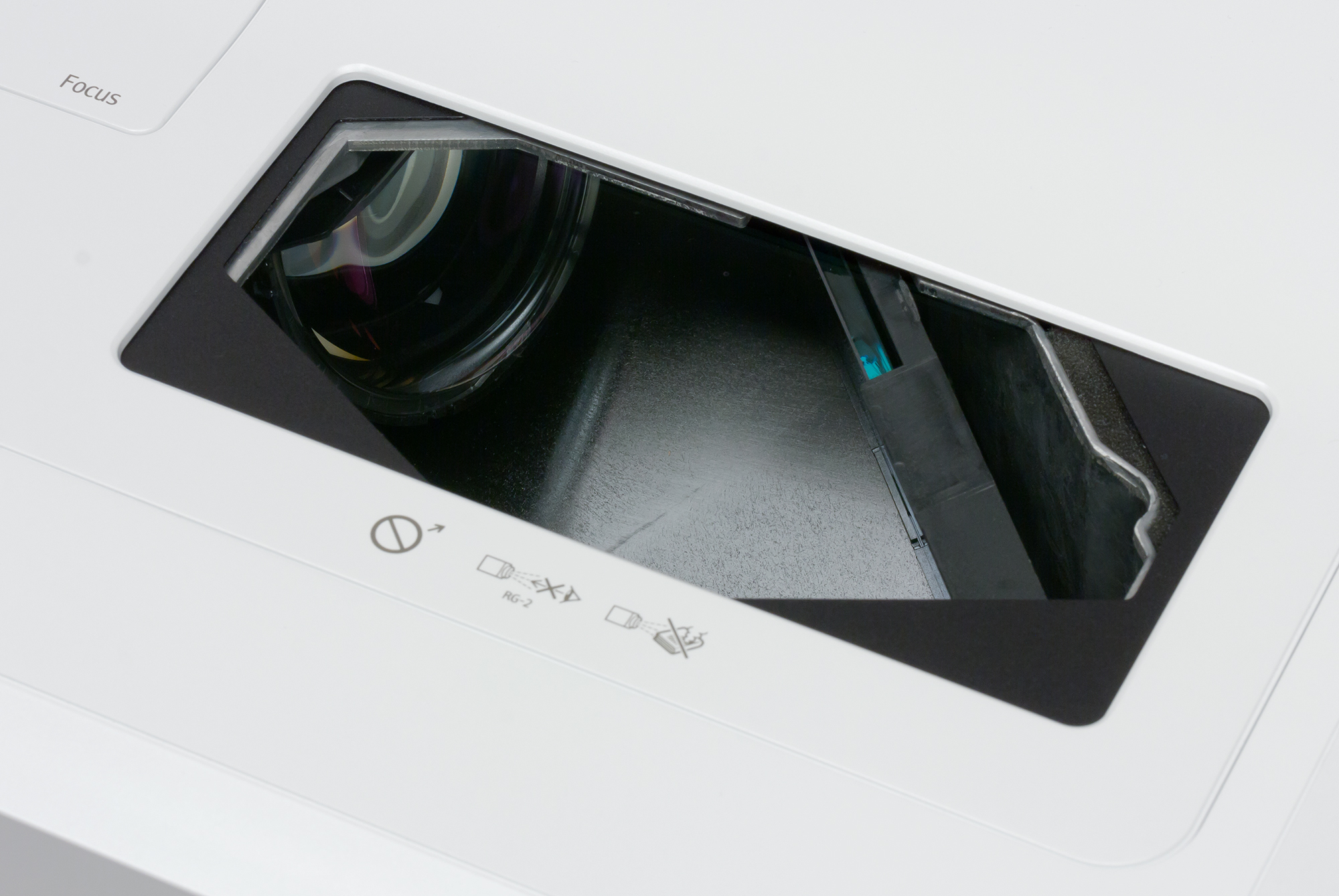 Проектор ультракороткофокусный, к тому же объектив смещен назад, поэтому при размещении проектора практически впритык к экрану можно получить изображение большого размера. Фокусировка изображения на экране осуществляются вращением ребристого кольца, а регулировка размера проекции — рычажком под крышкой рядом.