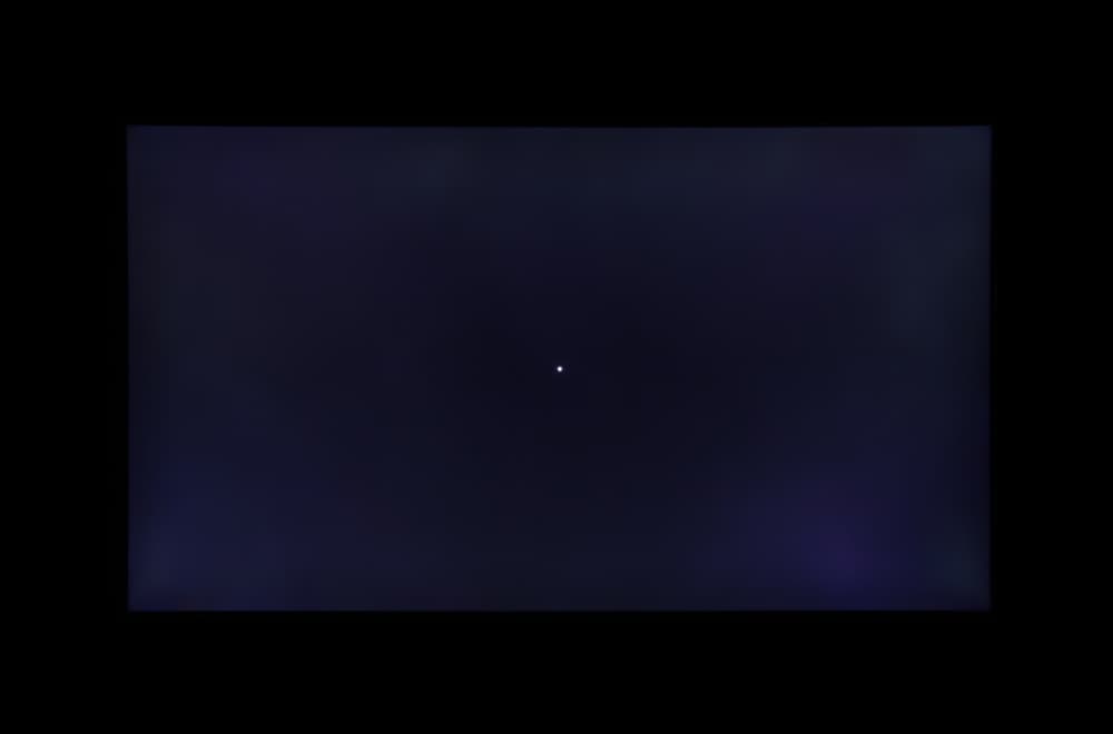 Если отступить от краев, то равномерность яркости белого по площади экрана очень хорошая, а равномерность черного, и как следствие контрастности немного ниже. Визуально видно, что к краям и особенно к углам белое поле заметно темнеет. На черном поле можно заметить незначительную вариацию засветки по площади экрана (белая точка в центре не дает подсветке отключиться):
