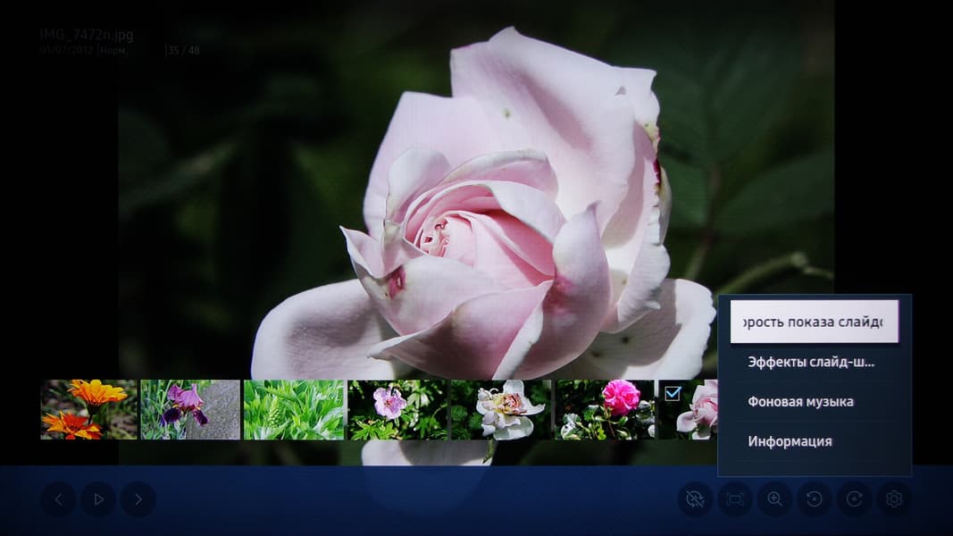 Нами подтверждена способность телевизора показывать растровые графические файлы в форматах JPEG, MPO (один ракурс), PNG и BMP, в том числе в виде слайд-шоу с эффектами перехода и под выбранную фоновую музыку. Изображения размером 3840×2160 пикселей выводятся один к одному по пикселям в истинном разрешении 4К и даже без снижения цветовой четкости. Присутствует режим просмотра панорамных изображений 360 градусов.