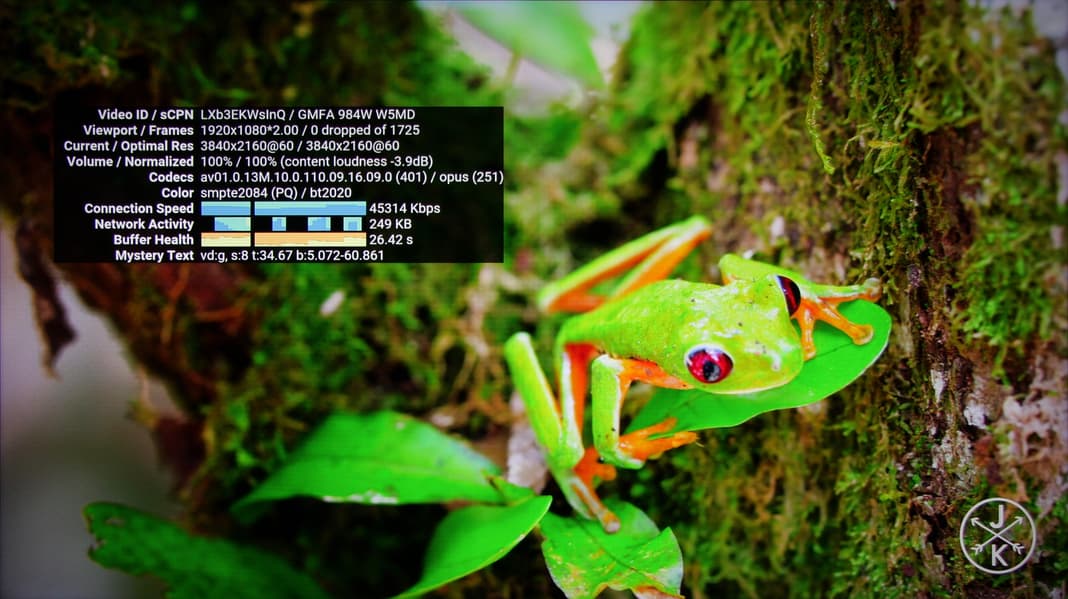 Тестовые ролики на определение равномерности чередования кадров помогли выявить, что телевизор при воспроизведении видеофайлов подстраивает частоту обновления экрана под частоту кадров в видеофайле. В стандартном для видео диапазоне (16—235) отображаются все градации оттенков. Максимальный битрейт видеофайлов, при котором еще не было артефактов, при воспроизведении с USB-носителей составил 200 Мбит/с (H.264, http://jell.yfish.us/), по Wi-Fi (сеть в диапазоне 5 ГГц) — 200 Мбит/с, по проводной сети Ethernet — 80 Мбит/с. В последних двух случаях использовался медиасервер роутера Asus RT-AC68U. Статистика на роутере показывает, что по Wi-Fi скорость приема/передачи составляет 866,7 Мбит/с, то есть в телевизоре установлен адаптер 802.11ac.
