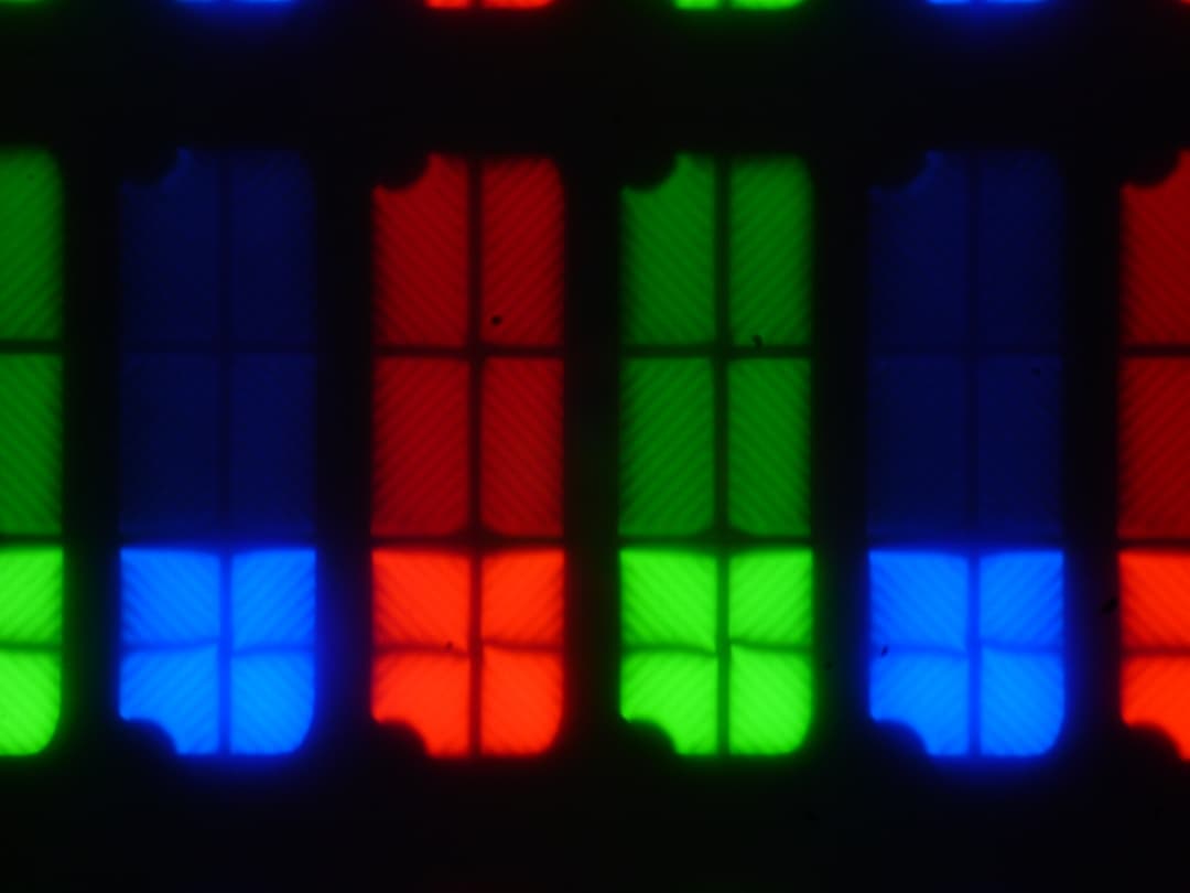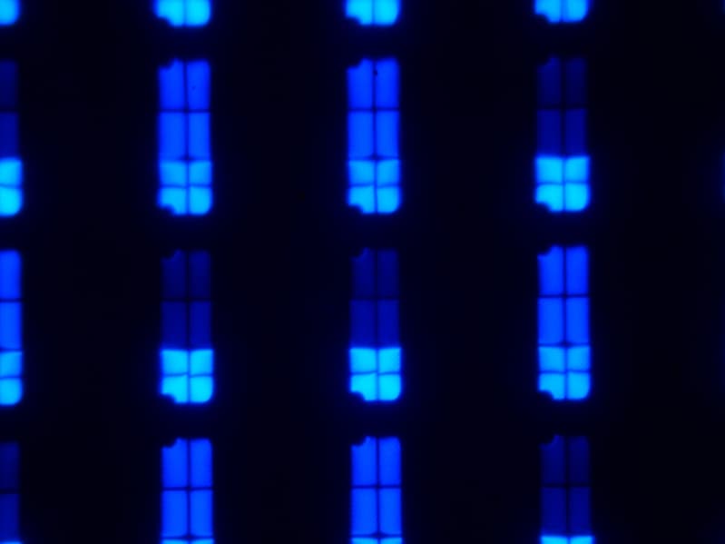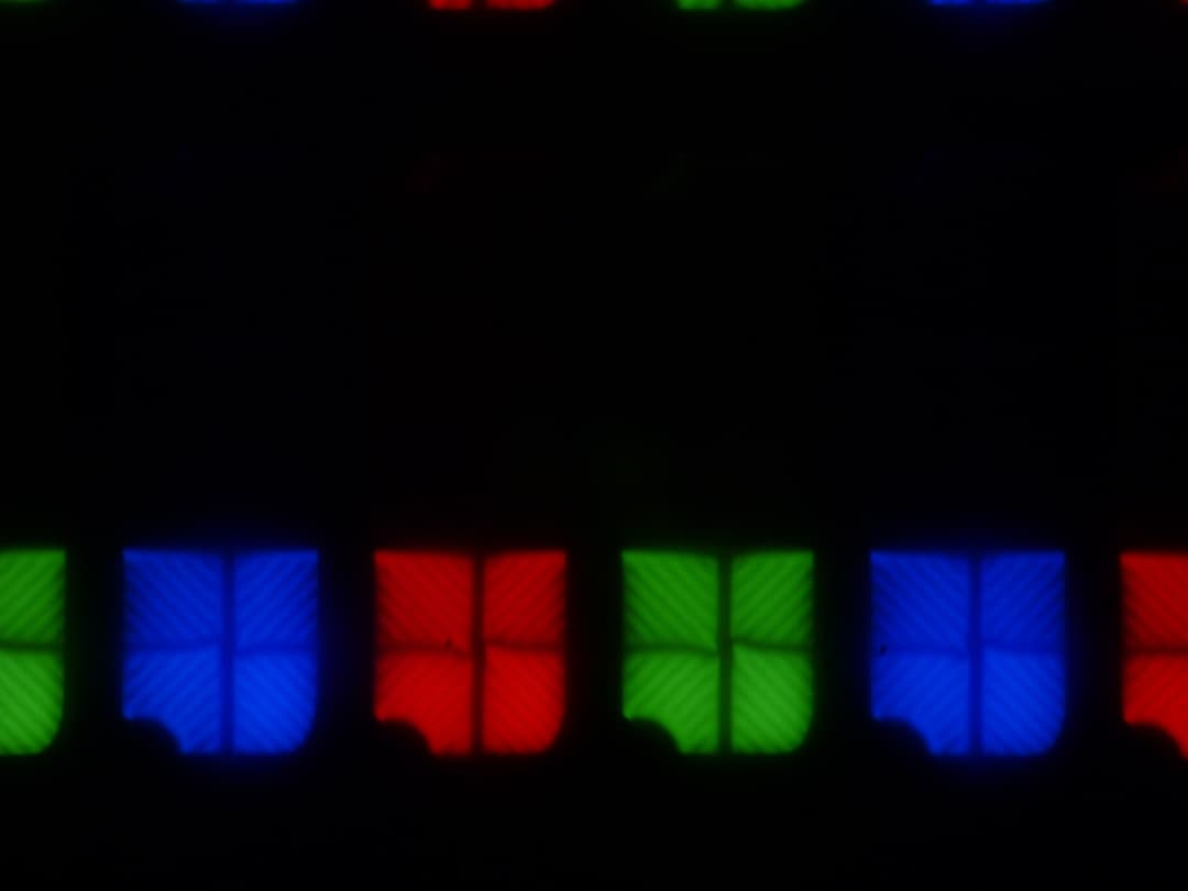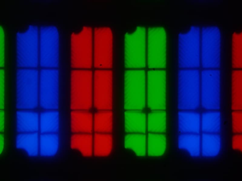 В случае сигнала 4К с исходной цветовой четкостью (вывод в режиме RGB или компонентного сигнала с кодированием цвета 4:4:4) и при 60, 59 (59,94?), 30 и 29 (29,97002616?) кадр/с, вывод собственно изображения на экран ТВ осуществляется без снижения цветовой четкости (если для имени источника выбрано значение PC или ПК), но не доступны некоторые настройки изображения, выбор цветового охвата в частности. При таком же разрешении, но при других условиях есть небольшое снижение цветовой четкости по горизонтали, а полутона выводятся с чередованием яркости пикселей. Ниже приведены микрофотографии, полученные при выводе темно-синего цвета. Сначала в режиме ПК 60 кадр/с: