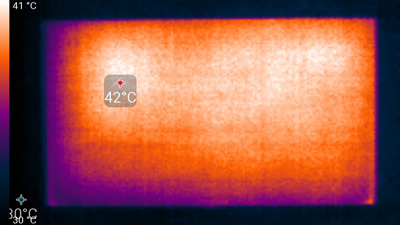 Нагрев телевизора можно оценить по приведенному снимку с ИК-камеры, полученному после долговременной работы на максимальной яркости в помещении с температурой примерно 24 °C:
