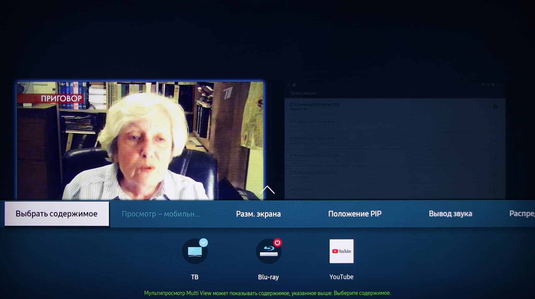 В режиме Cast на телевизор по Wi-Fi можно передавать копию экрана мобильного устройства и звук, но для просмотра видео данный режим подходит плохо, так как дополнительно привносятся артефакты сжатия, а частота кадров снижается. Трансляция в режиме Cast (Smart View в терминологии производителя) может вестись в режиме Multi View, когда на экране ТВ одновременно выводится изображение экрана мобильного устройства или картинка от одного из входов ТВ или с YouTube. Заявлено, что Multi View работает и в случае подключения с помощью Apple AirPlay. Практическая ценность Multi View не очевидна, но может кому-то и пригодится.