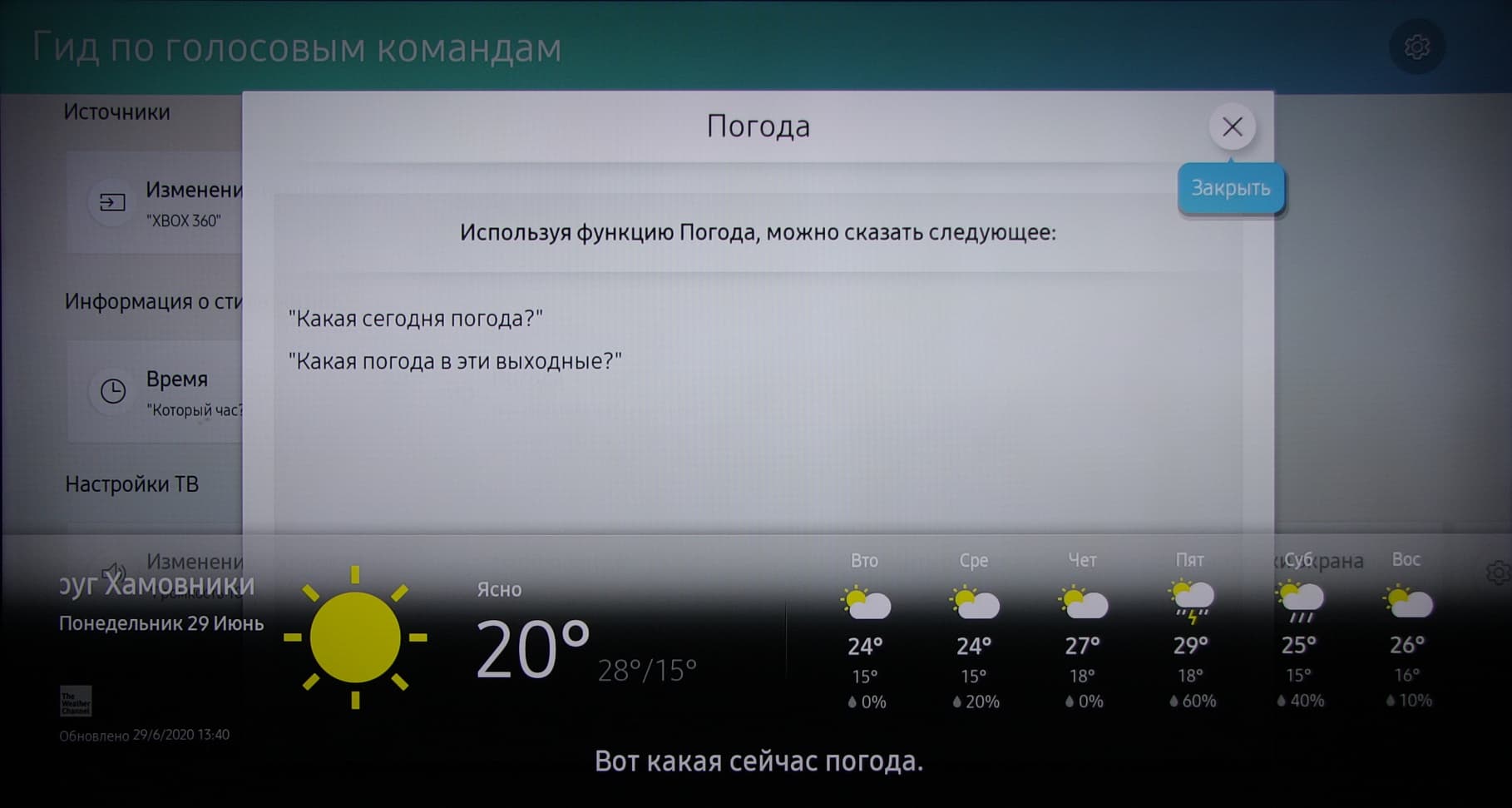 Извлечь их помогают кнопки сбоку, нажатие на которые приподнимает торец элемента питания. Кнопок на пульте немного, их обозначения не очень контрастные. Ход кнопок короткий и умеренно тугой. Есть две кнопки-качалки изменения громкости и переключения ТВ-каналов. Короткое нажатие на эти кнопки без отклонения выключает/включает звук и выводит ТВ-программу; длинное нажатие — показывает меню улучшения доступности и список ТВ-каналов, соответственно. Подсветки нет. В передней части пульта есть отверстие микрофона, через которое видно мигание красного индикатора, указывающего на передачу команд с пульта. Нажатие на кнопку с изображением микрофона приглушает звук телевизора и переводит его в состояние ожидания голосовой команды. О каких-то воспринимаемых телевизором командах можно догадаться, что-то можно подсмотреть во встроенной справке. Но не всегда инструкция в справке соответствует реальности. В целом странностей и несоответствий в случае голосового управления слишком много, поэтому оно скорее не работает, чем работает. Надеемся, что работа данной функции будет улучшена в ближайшем обновлении ПО телевизора. Голосовой поиск и ответы на некоторые типичные вопросы, например, про погоду, работают хорошо.