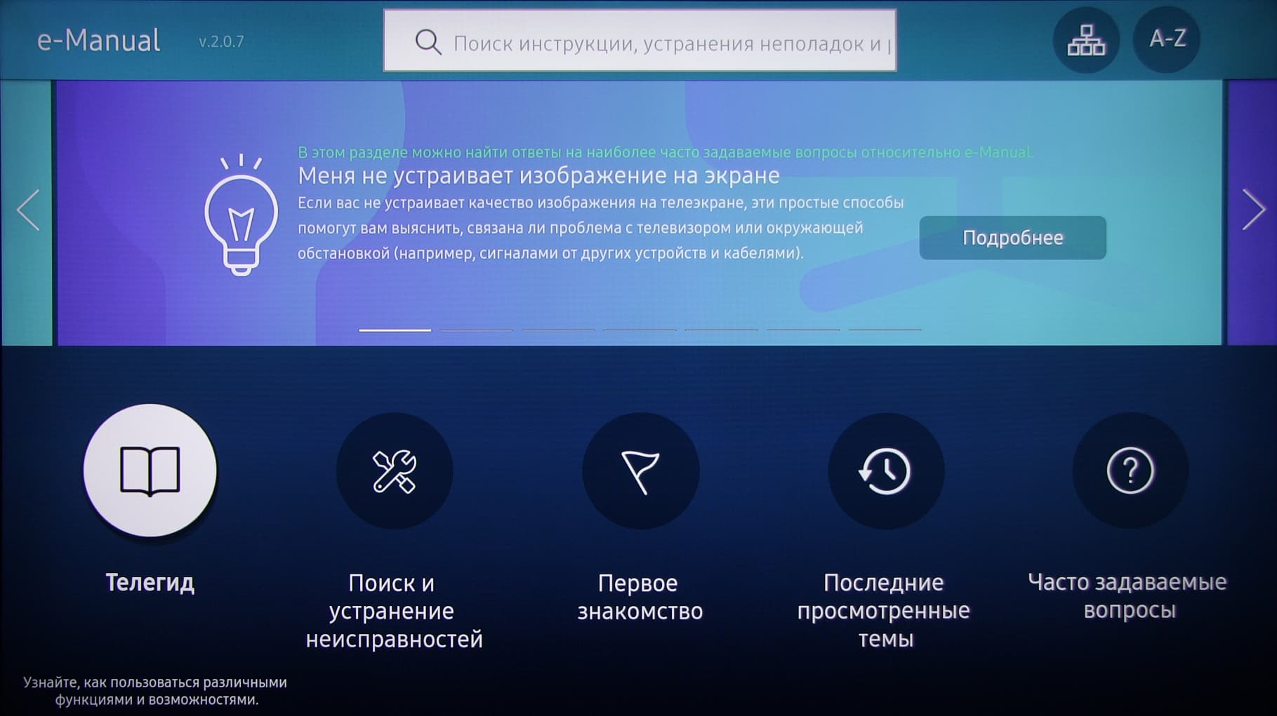 Некоторое неудобство заключается в том, что списки в меню не зациклены, поэтому добравшись до последнего пункта, часто приходится перематывать список обратно в начало, или выходить на уровень выше и снова заходить в список. Это относится и к лентам на главной странице, и к списку приложений. Во время настройки изображения можно выбрать режим применения настроек ко всем входам (но некоторые режимы все равно настраиваются отдельно). В телевизор встроена объемная по содержанию интерактивная справочная система.
