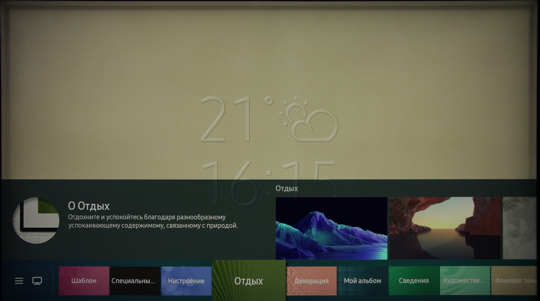 Специальный режим Ambient предназначен для демонстрации заставки на условно выключенном телевизоре. В этот режим работающий телевизор переключается при коротком нажатии на специальную кнопку на пульте, или из главного меню, или из приложения SmartThings, или голосовой командой.