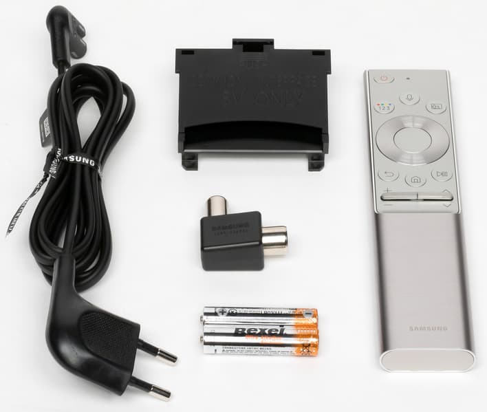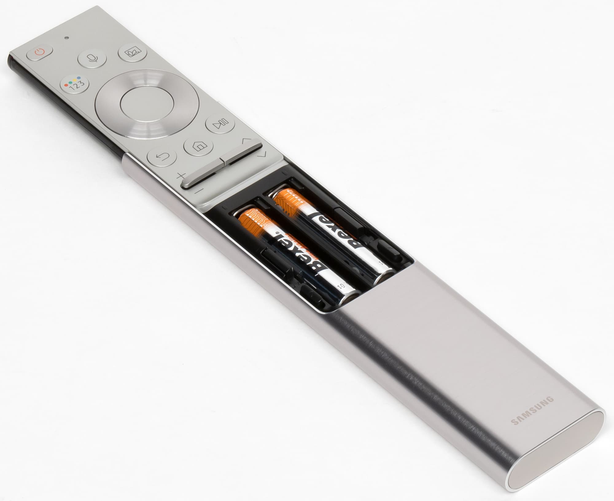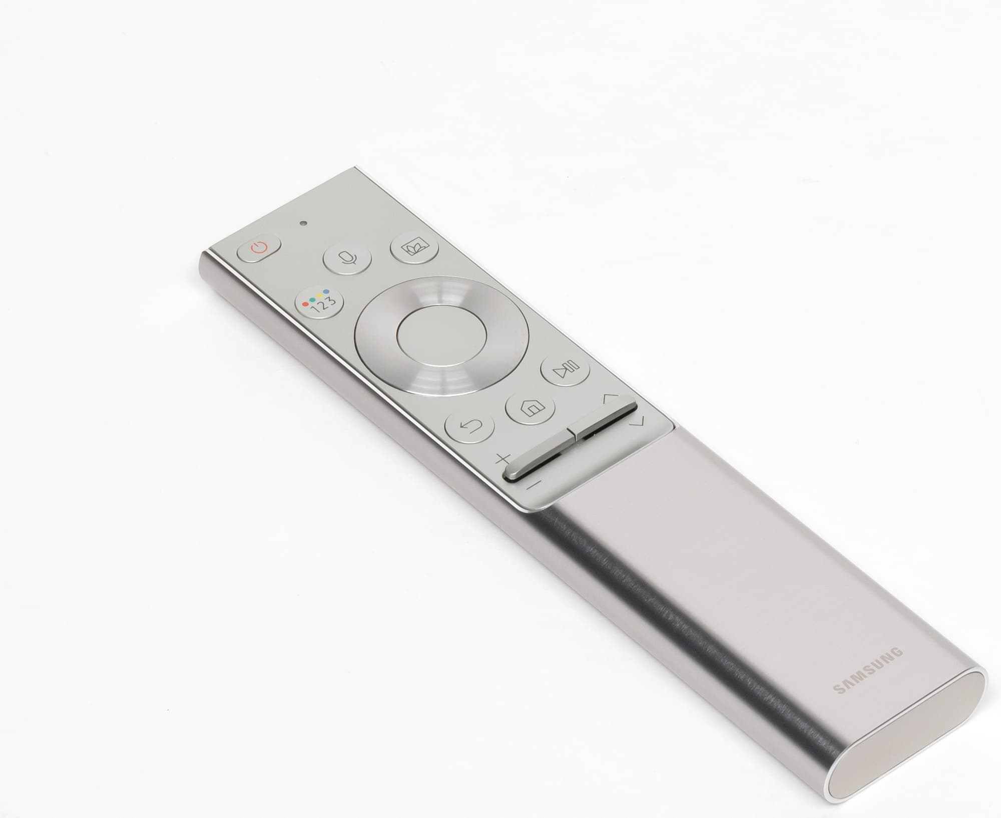 Пульт имеет типичную для топовых ТВ Samsung конструкцию. Пульт небольшой (158×36×13 мм) и нетяжелый (92 г с родными элементами питания). Нажав на кнопку снизу, можно сдвинуть