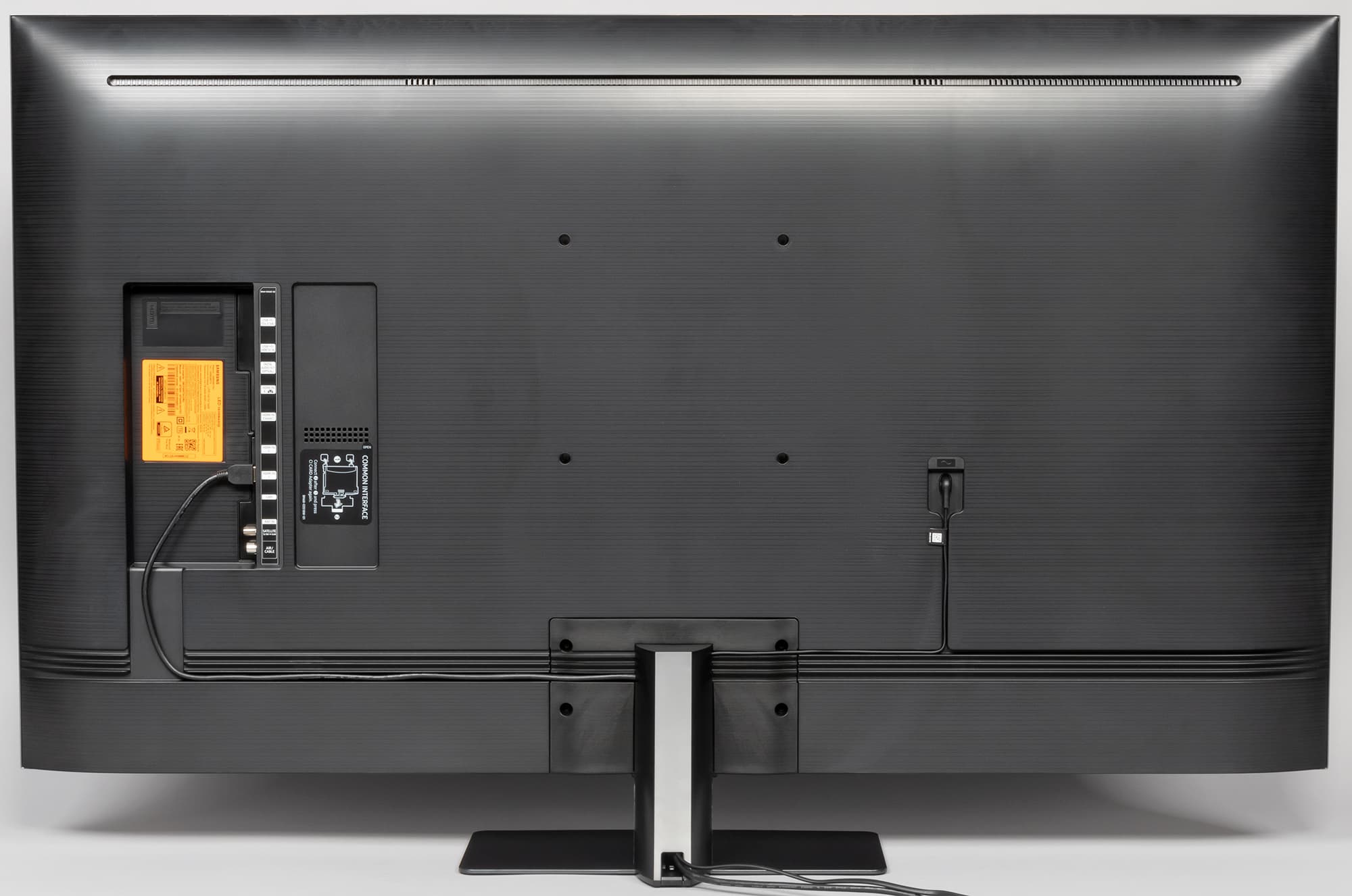 Основные интерфейсные разъемы размещены в нише сзади и направлены вбок. Подключать кабели к ним относительно удобно. Рядом с ними в неглубокой нише есть разъем для адаптера карты CI, закрытый наклейкой с инструкцией по установке этого адаптера. В отдельной небольшой нише находится разъем питания. Кабель питания и кабели от интерфейсных разъемов можно уложить в канавки сзади на кожухе, пропустить под кожухом стойки и вывести вниз по центру.