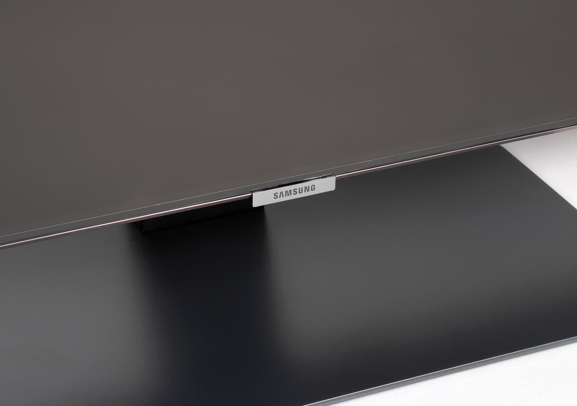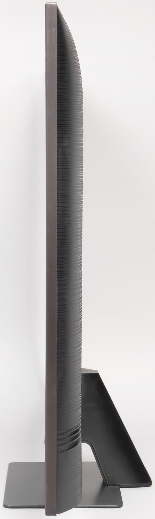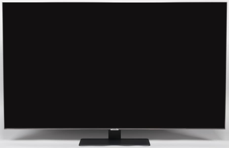 Дизайн строгий, декоративные элементы отсутствуют, в основном используются серый и черный цвета. Телевизор выглядит аккуратно как спереди, так и сзади. Экран не имеет рамок, в том смысле, что на его монолитной поверхности нет накладных выступающих вперед за плоскость элементов, есть только узкое обрамление из алюминиевого профиля. Этот профиль анодирован и окрашен в темно-серый цвет (черненое серебро — наименование от производителя). Выведя изображение на экран, можно увидеть, что между внешними границами экрана и собственно областью отображения есть неширокие поля (от области отображения до внешних границ экрана сверху и с боков по 9 мм, а снизу — 12 мм). По самому низу плоскости экрана идет узкая (примерно 4,5 мм) полоска из прозрачного пластика. Внешняя поверхность матрицы полуматовая, но зеркальность хорошо выражена. Особыми антибликовыми свойствами матрица не обладает.