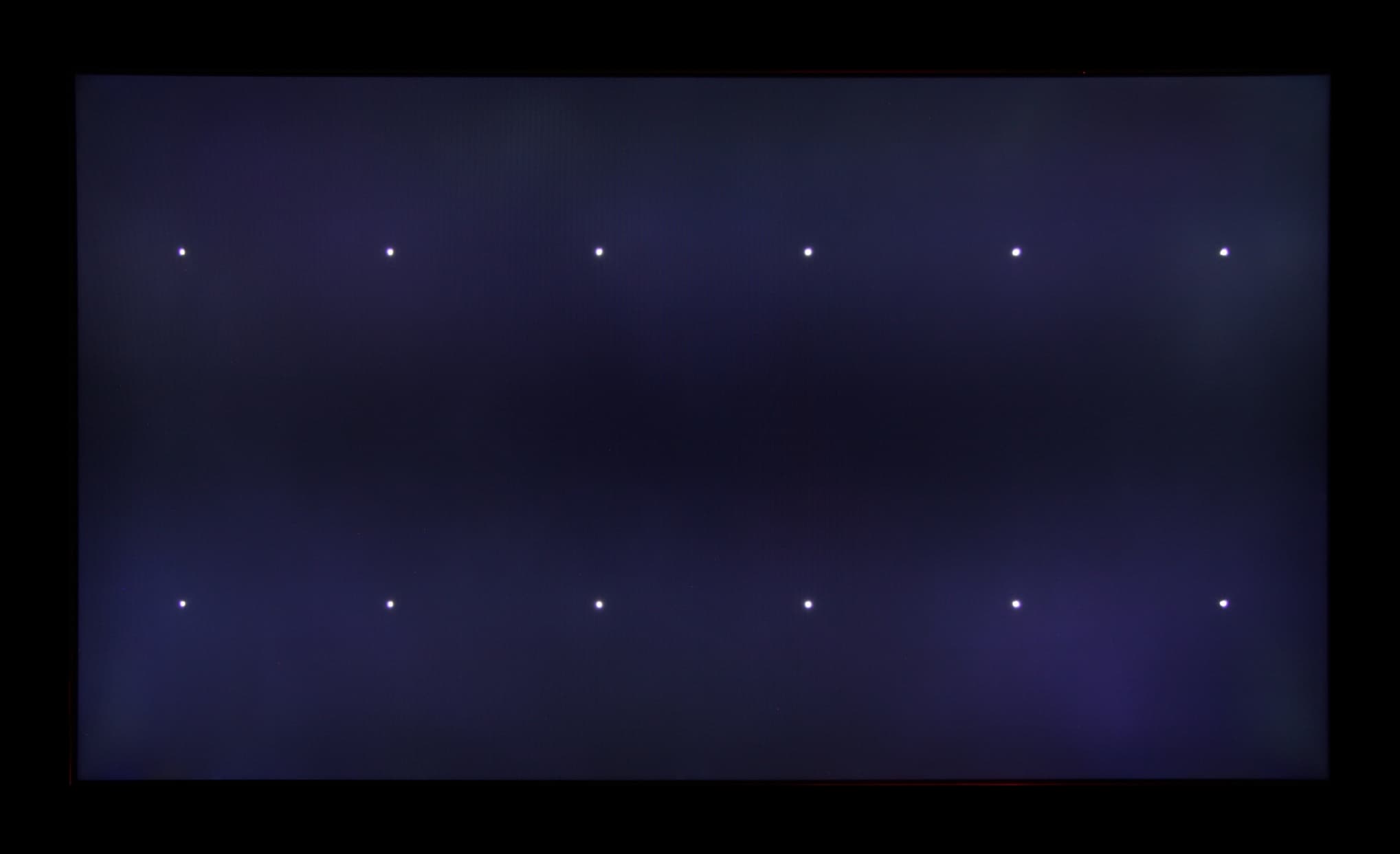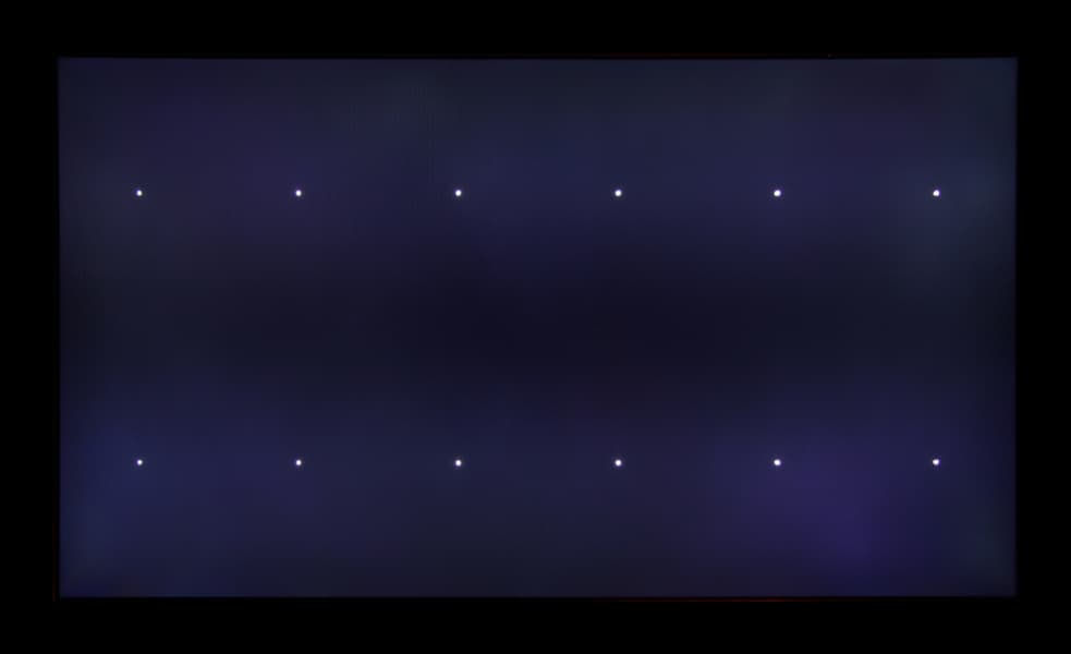 Контрастность в абсолютном значении довольно высокая, но для данного типа матриц мы ожидали получить значение порядка 3000:1. Если включить локальную подстройку яркости подсветки, то среднее значение контрастности возрастает до 2150:1. Так как светодиодов подсветки во много раз меньше, чем пикселей в матрице, то каждый светодиод освещает область из нескольких тысяч пикселей. Из-за этого на некоторых типах изображений могут быть артефакты в виде локальной засветки вокруг или около ярких объектов. Например, в случае тестового изображения с белыми точками: