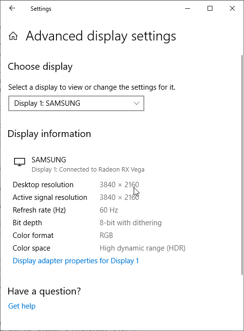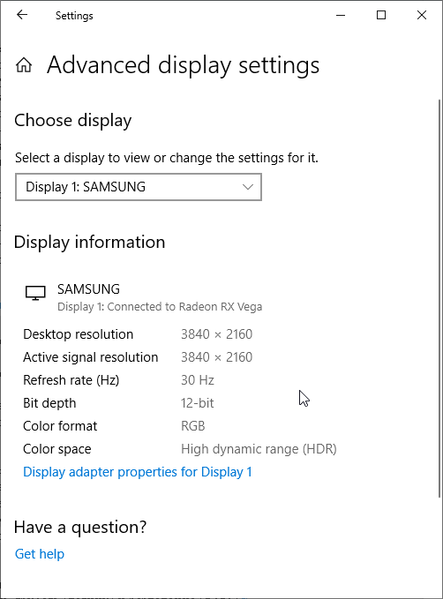 Под Windows 10 вывод в режиме HDR на данный телевизор возможен при выборе соответствующих опций в настройках дисплея. При разрешении 4К и 60 Гц вывод идет в режиме 8 бит на цвет, дополненных динамическим смешением цветов, видимо, с помощью видеокарты на аппаратном уровне. При 30 Гц — 12 бит на цвет (динамическое расширение до 10 бит выполняется уже самим ТВ):