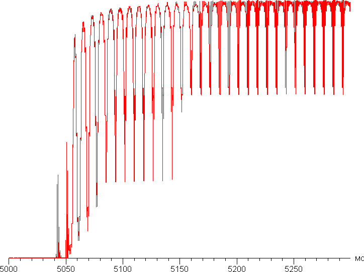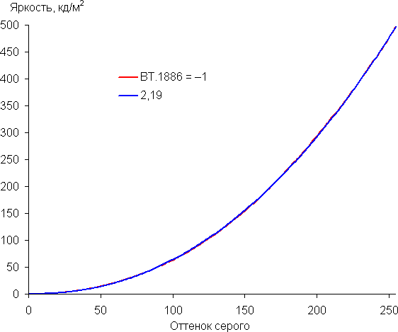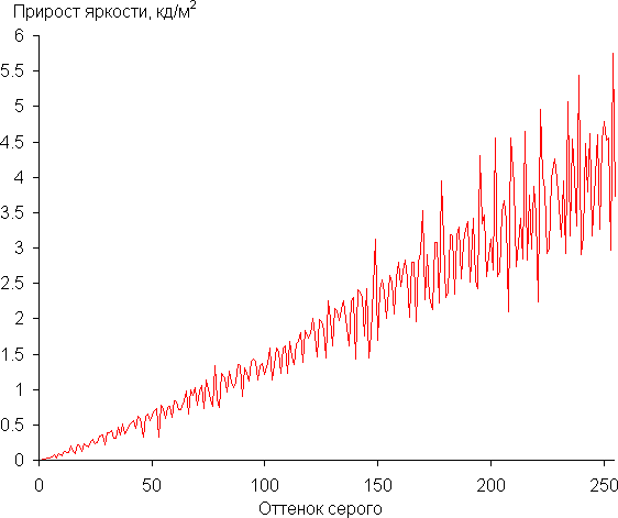 Для оценки характера роста яркости мы измерили яркость 256 оттенков серого (от 0, 0, 0 до 255, 255, 255) при подключении к ПК в режиме RGB при 3840×2160 и 60 Гц, параметр Гамма в настройках ТВ — BT.1886 = -1, Контраст = 50. График ниже показывает прирост (не абсолютное значение!) яркости между соседними полутонами: