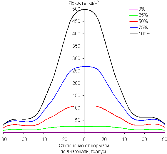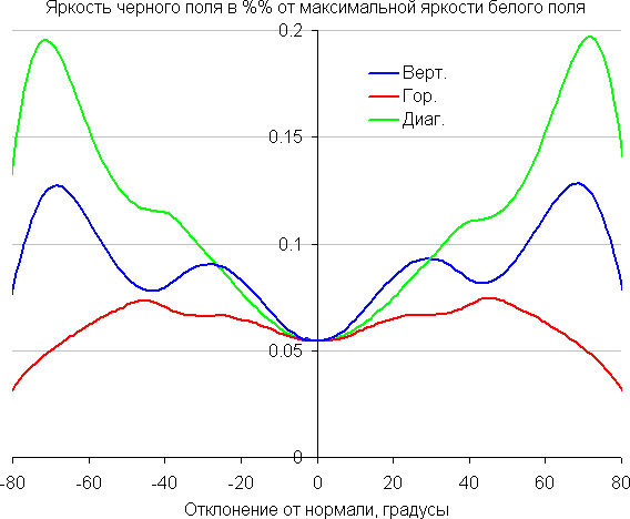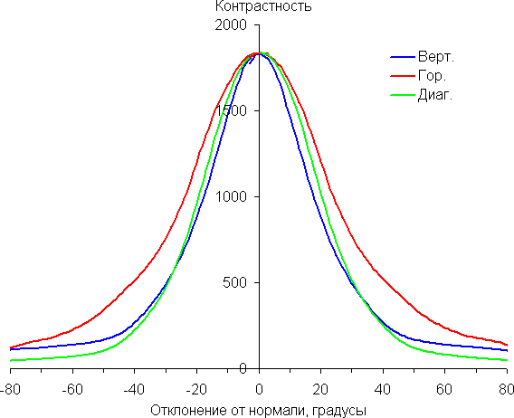 Отметим плавное, но все же относительно быстрое уменьшение яркости при небольшом отклонении от перпендикуляра к экрану во всех трех направлениях. Графики яркости полутонов не пересекаются во всем диапазоне измеряемых углов. Яркость черного поля при отклонении от перпендикуляра к экрану возрастает, но всего до примерно 0,2% максимум от максимальной яркости белого поля. Это хороший результат. Контрастность в диапазоне углов ±82° не опускается ниже отметки 10:1.