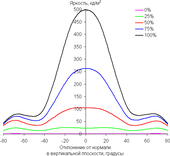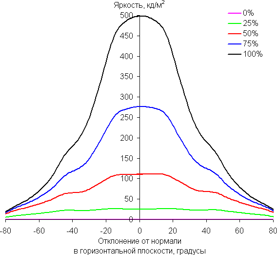 В качестве реперной точки можно выбрать отклонение в 45°. Критерием сохранения правильности цветов можно считать значение ΔE меньше 3. Из графиков следует, что при взгляде под углом основные цвета меняются несильно, но полутона изменяются существенно, что ожидаемо для матрицы типа VA* и является ее основным недостатком.