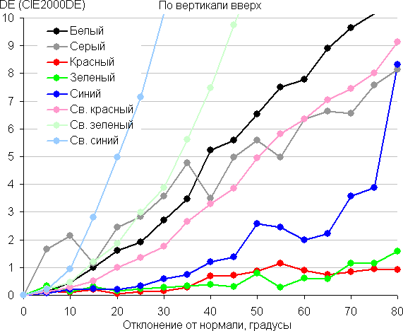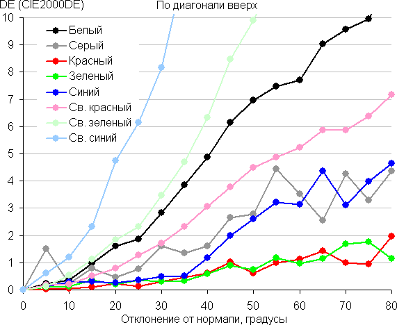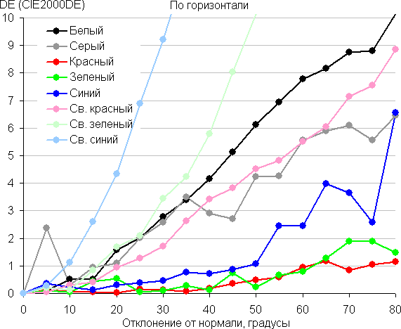 Для количественной характеристики изменения цветопередачи мы провели колориметрические измерения для белого, серого (127, 127, 127), красного, зеленого и синего, а также светло-красного, светло-зеленого и светло-синего полей во весь экран с использованием установки, подобной той, что применялась в предыдущем тесте. Измерения проводились в диапазоне углов от 0° (датчик направлен перпендикулярно к экрану) до 80° с шагом в 5°. Полученные значения интенсивностей были пересчитаны в отклонение ΔE относительно замера каждого поля при перпендикулярном положении датчика относительно экрана. Результаты представлены ниже:
