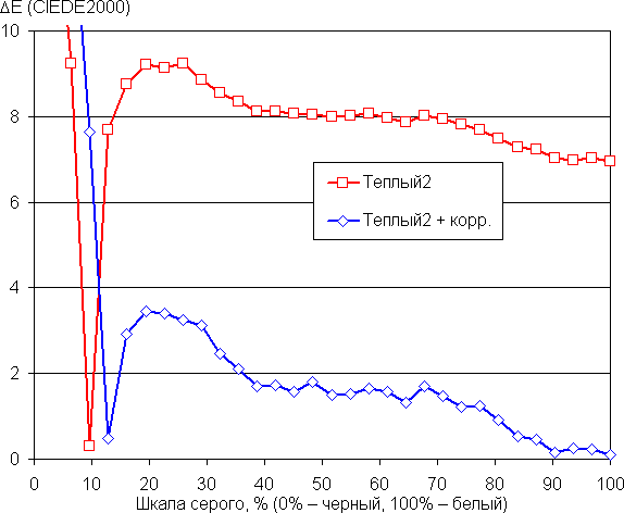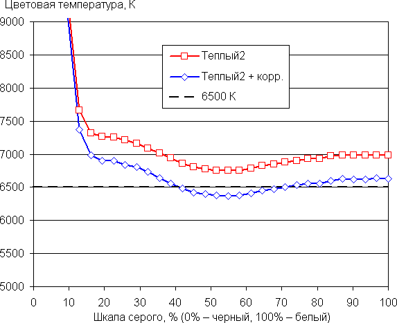 Графики ниже показывают цветовую температуру на различных участках шкалы серого и отклонение от спектра абсолютно черного тела (параметр ΔE) для профиля Стандартный при выборе варианта Теплый2 для настройки Оттенок и после небольшой коррекции цветового баланса настройками усиления трех основных цветов (значения 0, −13 и −9 для усиления красного, зеленого и синего цветов):