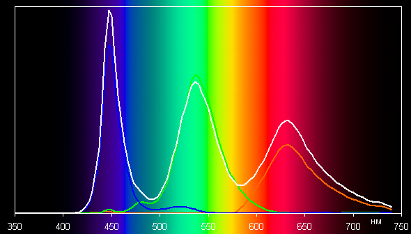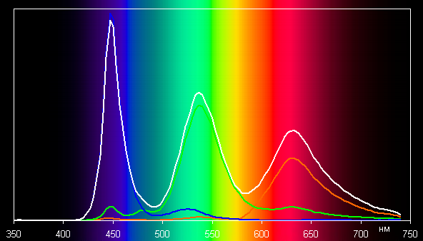 Ниже приведен спектр для белого поля (белая линия), наложенный на спектры красного, зеленого и синего полей (линии соответствующих цветов) для профиля Исходный:
