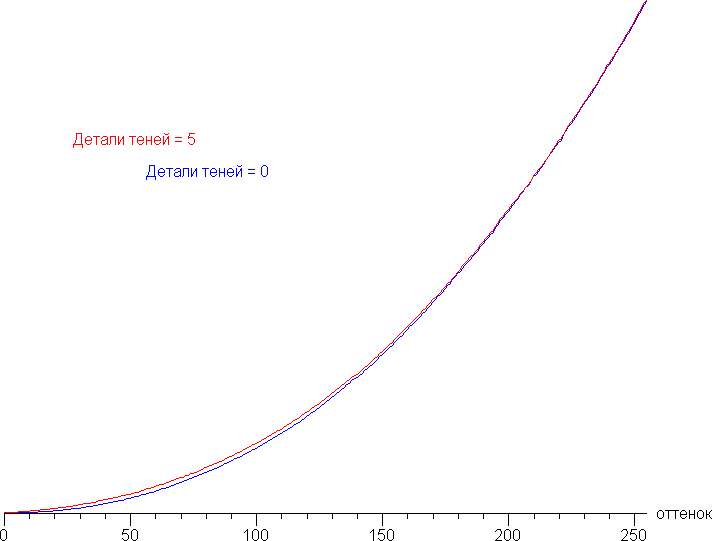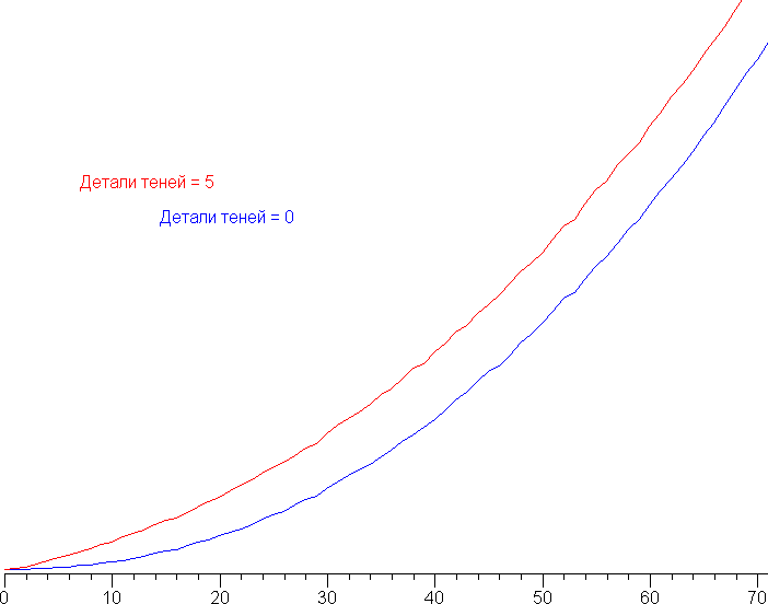 Игрокам может пригодиться функция, регулирующая видимость деталей в тенях, с названием Детали теней. Ниже показано как меняется гамма-кривая при крайнем значении этой настройки: