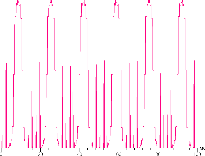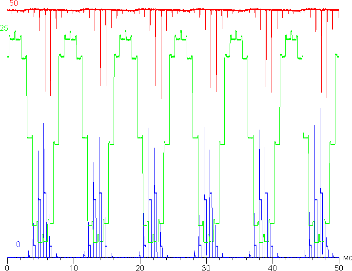 Управление яркостью свечения каждого из светодиодов подсветки осуществляется с помощью ШИМ с частотой 120 Гц. Ниже приведена зависимость яркости от времени, числа — это значения настройки Яркость: