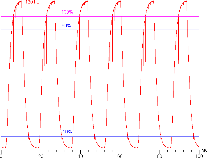Переход от черного к белому явно выбивается из общей картины, так как выполняется слишком медленно, и нет всплеска яркости, вызванного разгоном. Однако при смене черного на белый и сразу на черный скорость этого перехода возрастает, разгон появляется, и скорости матрицы уже достаточно для полноценного вывода изображения с частотой 120 Гц. В подтверждение приведем зависимость яркости от времени при чередовании белого и черного поля (на части площади экрана) при 120 Гц кадровой частоты (график с подписью 120 Гц):