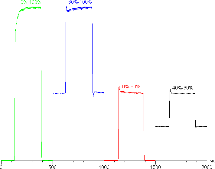 Время отклика при переходе черный-белый-черный равно 23 мс (19 мс вкл. + 4 мс выкл.). Среднее время отклика переходов между полутонами (от оттенка к оттенку и обратно) составляет 9,7 мс. Есть выраженный «разгон» матрицы. Впрочем, всплески яркости на фронтах переходов не приводят к появлению артефактов. Для примера приведем зависимости яркости от времени для нескольких переходов между оттенками.