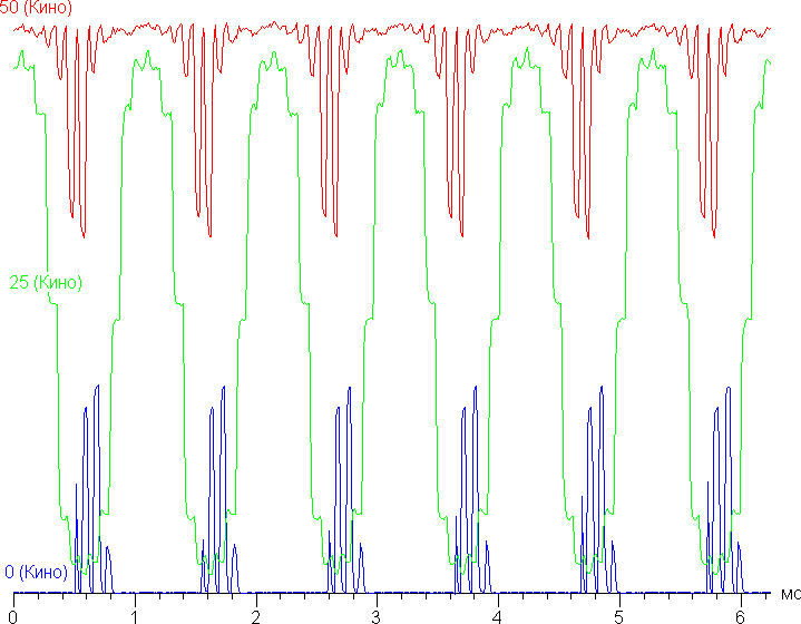 Однако, если включить режим Кино, то частота ШИМ возрастает до 960 Гц, что в совокупности с зональностью очень сильно снижает заметность мерцания — в обычных условиях его не видно. Ниже приведена зависимость яркости от времени для режима Кино.