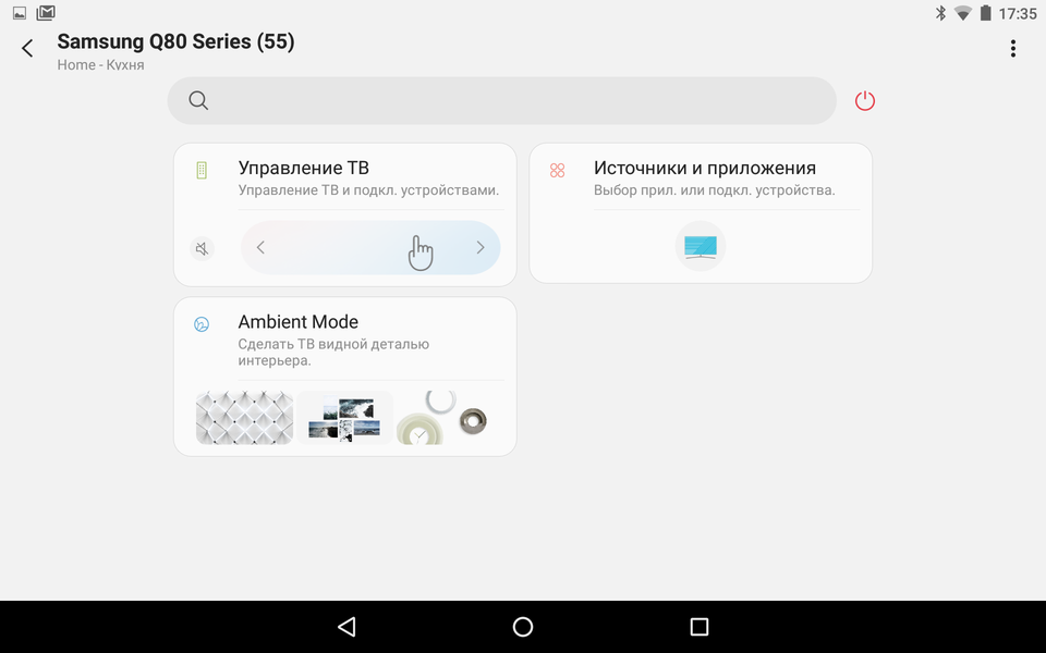 Телевизором можно управлять посредством мобильного устройства с помощью фирменного приложения SmartThings для Android и iOS. В данном ПО телевизор представляется как одним из устройств «умного дома», входящих в экосистему SmartThings. Для доступа к устройствам SmartThings используется облачный сервис, поэтому телевизором можно управлять из любого места, где есть доступ к Сети, хотя в данном случае это не дает особых преимуществ. В ПО SmartThings в главном окне модуля работы с телевизором есть виртуальный пульт ДУ с кнопками и панелью координатного ввода, панель выбора входов (только подключенных) и приложений (но у нас список не появился).