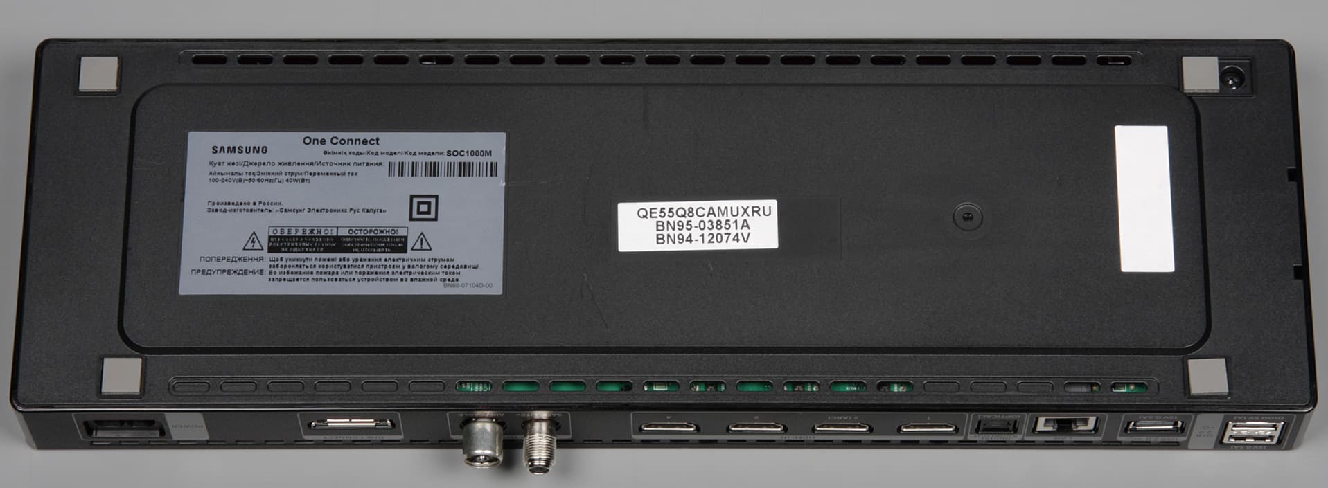 Модуль One Connect представляет собой относительно большую (390×130×67 мм) и тяжелую (2,5 кг) прямоугольную коробку.