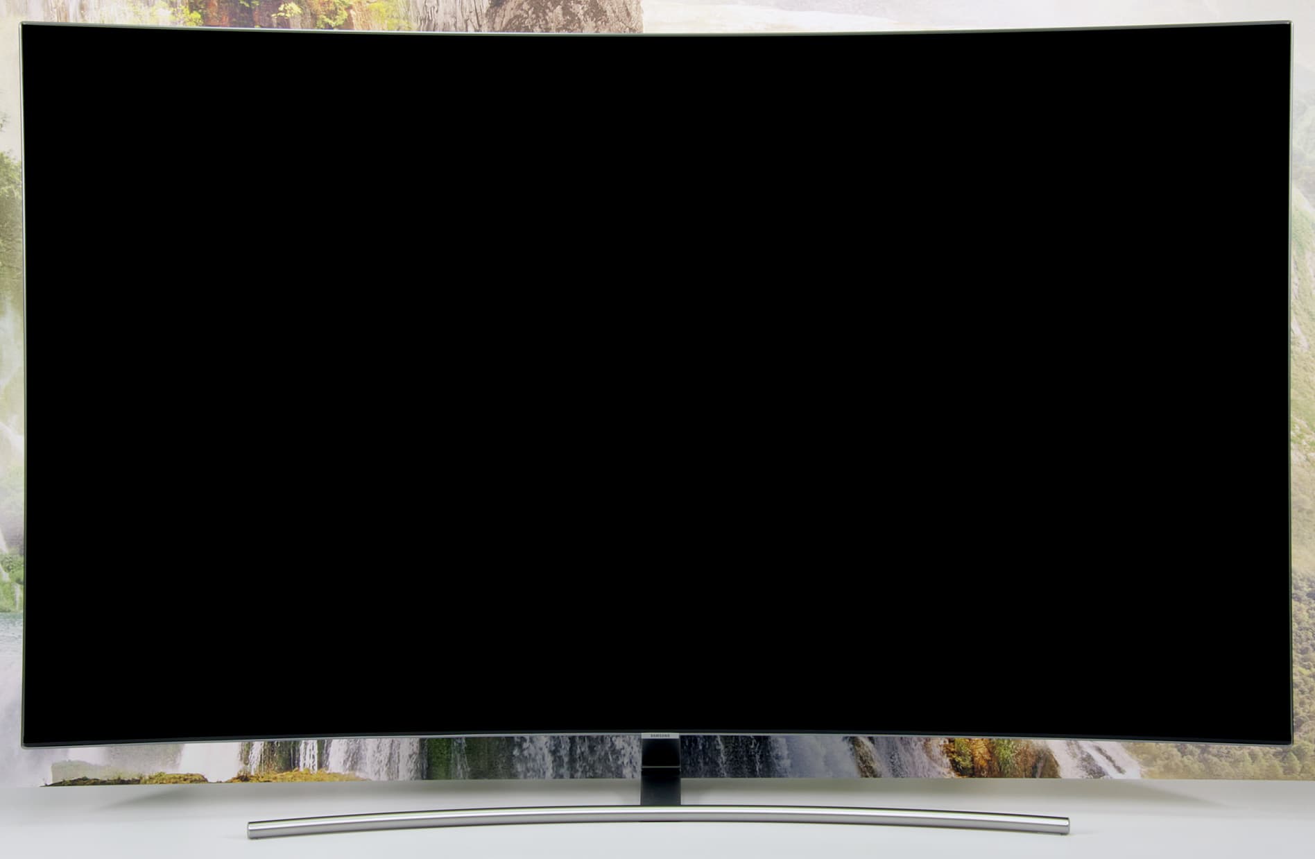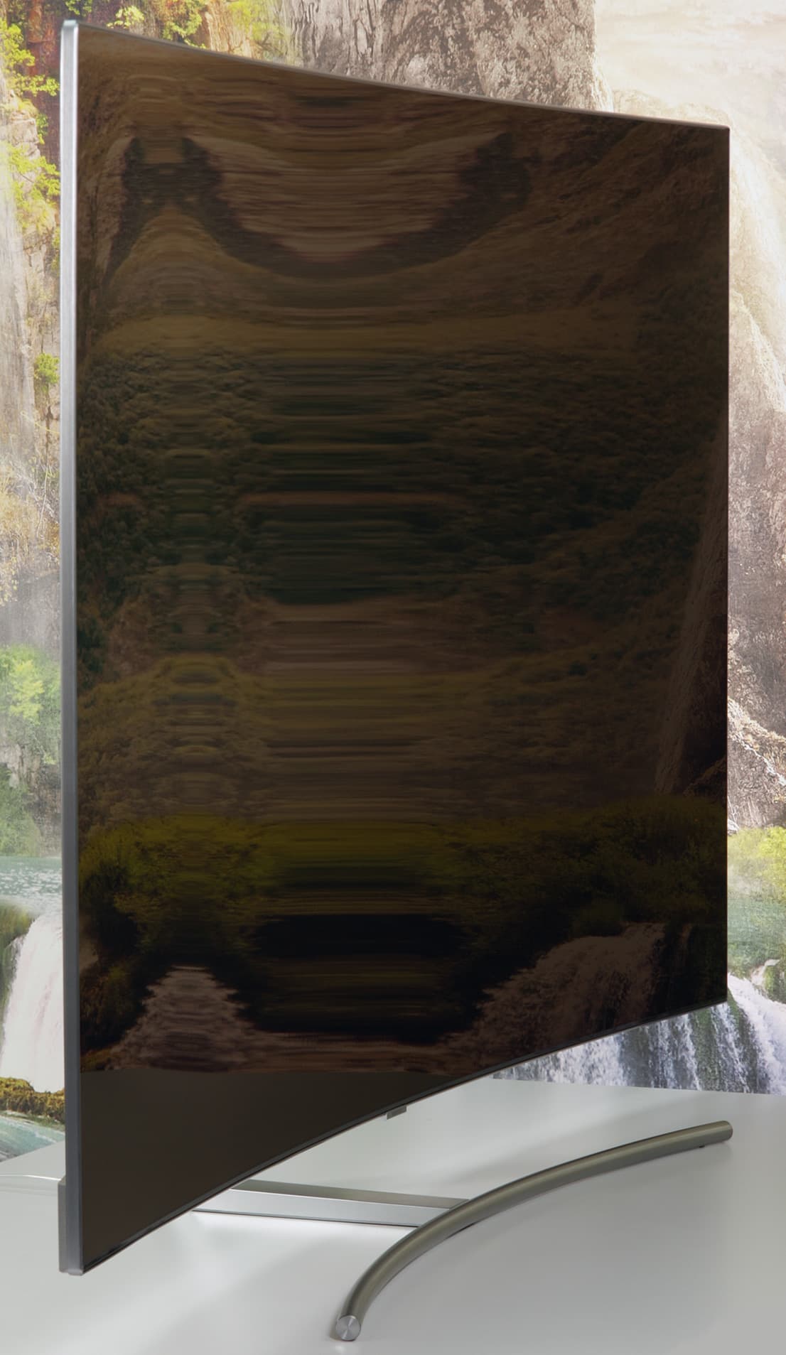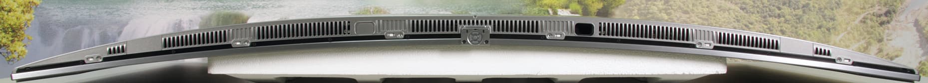 Экран представляет собой монолитную поверхность с тонким обрамлением из алюминиевого профиля без покрытия и с матовой поверхностью. Профиль узкий и скошен назад, но все же в некоторых случаях может слегка отсвечивать, отвлекая внимание. Ширина поля от границы области отображения до окантовки составляет всего 5-6 мм. По самому низу матрицы идет узкая (примерно 4 мм) полоска из пластика. Внешняя поверхность матрицы зеркально-гладкая и относительно устойчивая к повреждениям, так как даже после неоднократной очистки слегка влажной салфеткой на экране нет микроцарапин. Очень эффективный антибликовый фильтр снижает яркость отраженных объектов до такой степени, что зеркальность экрана просмотру не мешает, если только прямо напротив экрана нет очень ярких точечных источников света. При этом загрязнения не очень сильно влияют на антибликовые свойства. Предупредим, что к выбору средства для чистки экрана нужно подходить очень аккуратно и лучше, кроме чистой (дистиллированной) воды, ничем другим салфетку не смачивать, чтобы не повредить антибликовое покрытие. По отражению в экране видно, что изгиб более-менее равномерный и его радиус составляет порядка четырех метров, и только по бокам в вертикальной области около 10-15 см экран скорее плоский.