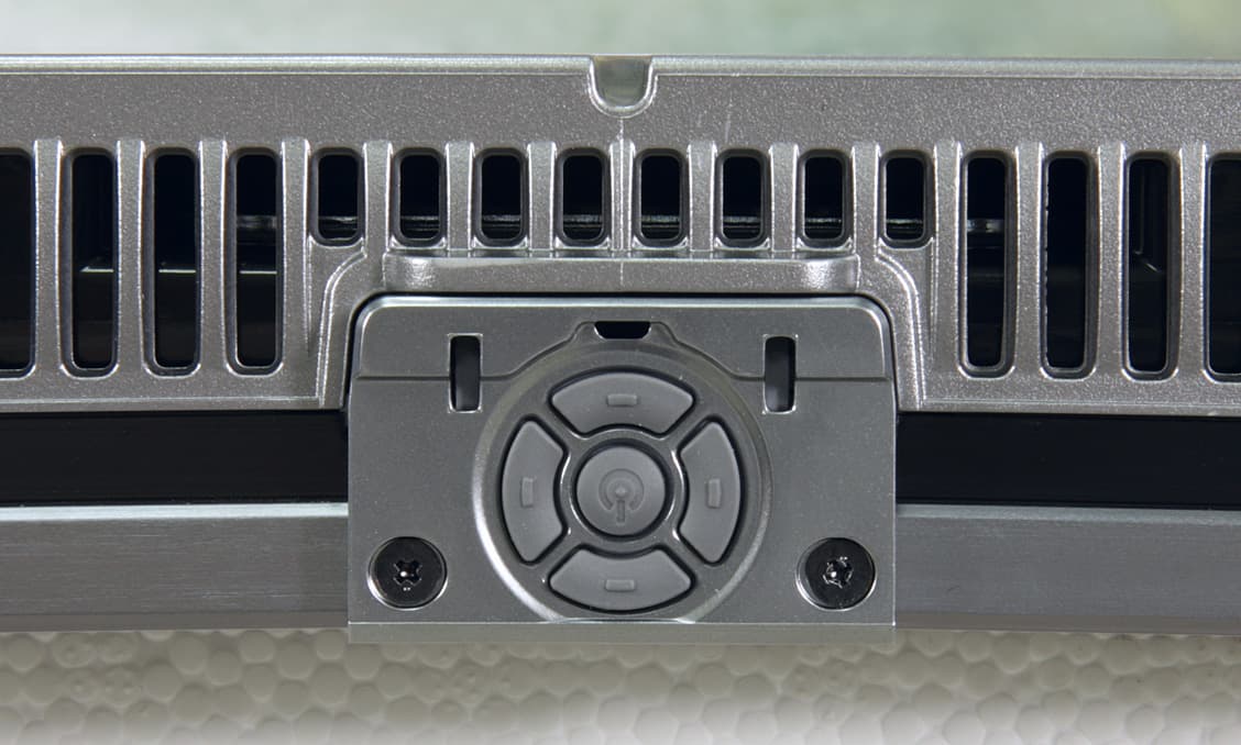 За вставкой скрываются ИК-приемник пульта ДУ и датчик внешней освещенности. На нижнем торце за этой вставкой находятся кнопки управления, с помощью которых можно очень ограниченно управлять телевизором без помощи пульта ДУ и индикатор состояния. Индикатор неяркий, в дежурном режиме он светится красным. Кнопки выполнены из упругого пластика, при срабатывании они негромко щелкают.