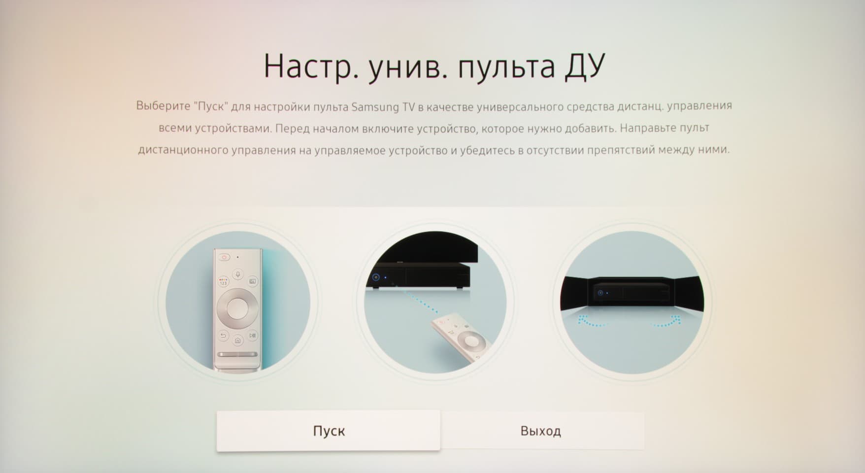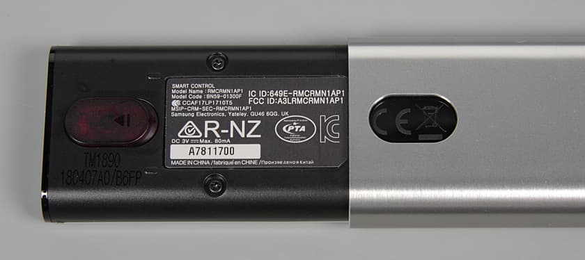Работает пульт в основном по Bluetooth, по ИК дублируется только команда включения и выключения. Побочным следствие этого является необходимость выполнять сопряжение пульта и телевизора. При первом включении сопряжение должно выполняться автоматически, если этого не произошло, то необходимо направить пульт на ИК-приемник на телевизоре, затем нажать и удерживать две кнопки на ДУ, как это описано в руководстве. К несомненным плюсам относится возможность настроить этот пульт на управление другой аудио- и видеотехникой. Делается это при подключении новой для телевизора техники в полуавтоматическом режиме или согласно выводимым на экран подсказкам. При этом используются ИК-излучатели или пульта, или размещенные внутри модуля One Connect, в зависимости от того, на какой источник реагирует управляемая техника.