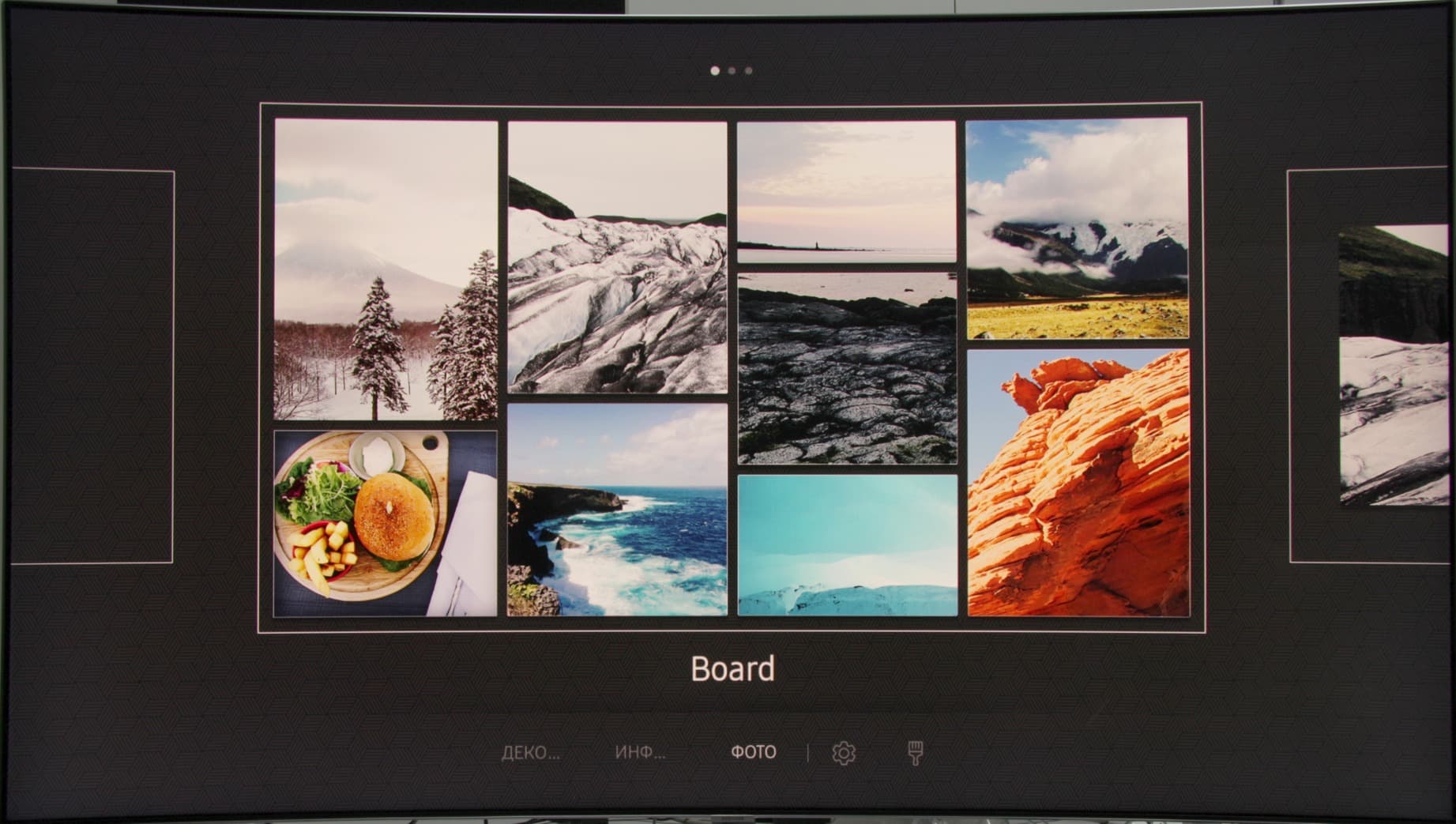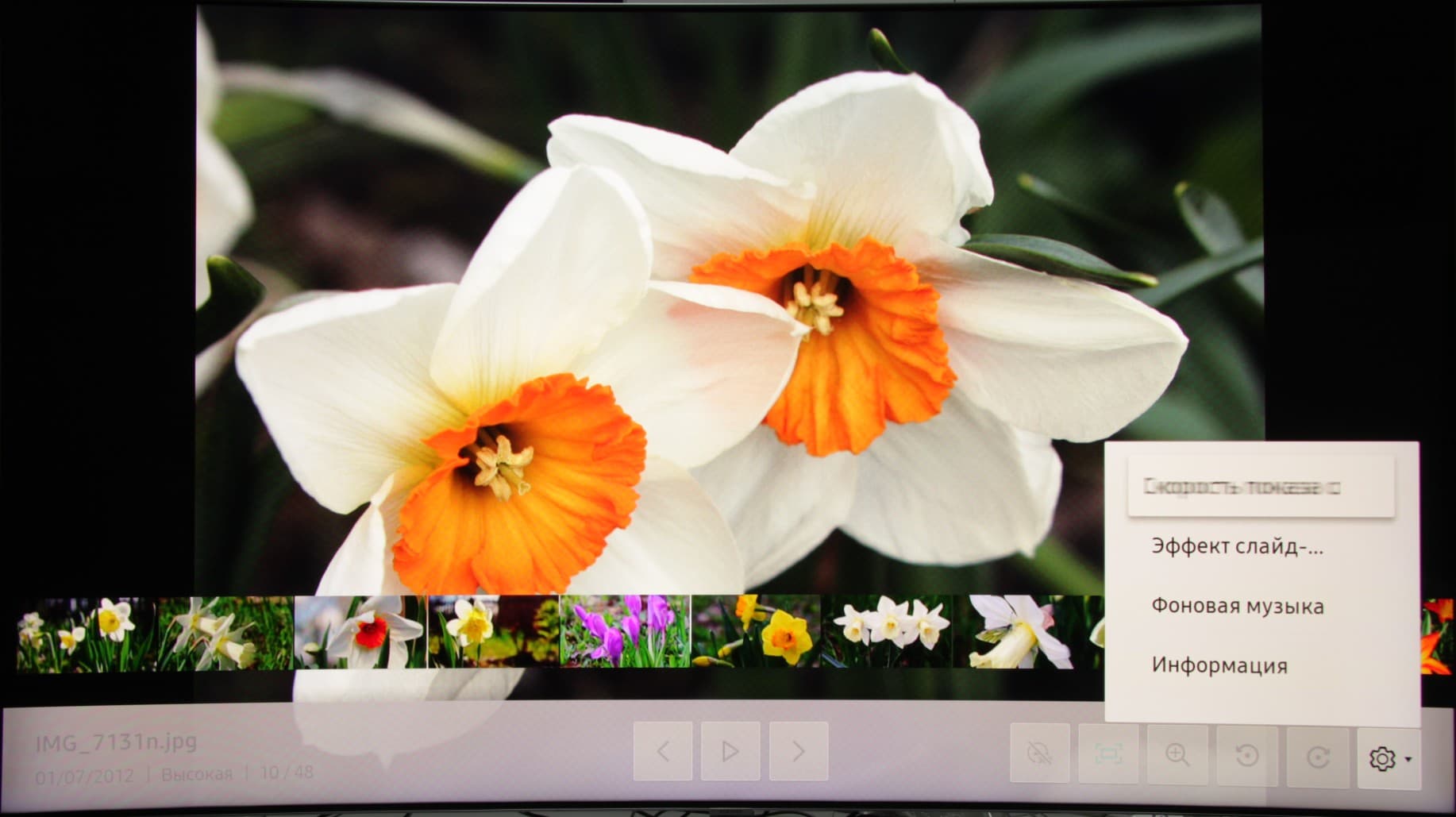 Нами подтверждена способность телевизора показывать растровые графические файлы в форматах JPEG, MPO (один ракурс), PNG и BMP, в том числе в виде слайд-шоу с эффектами перехода и под выбранную фоновую музыку.