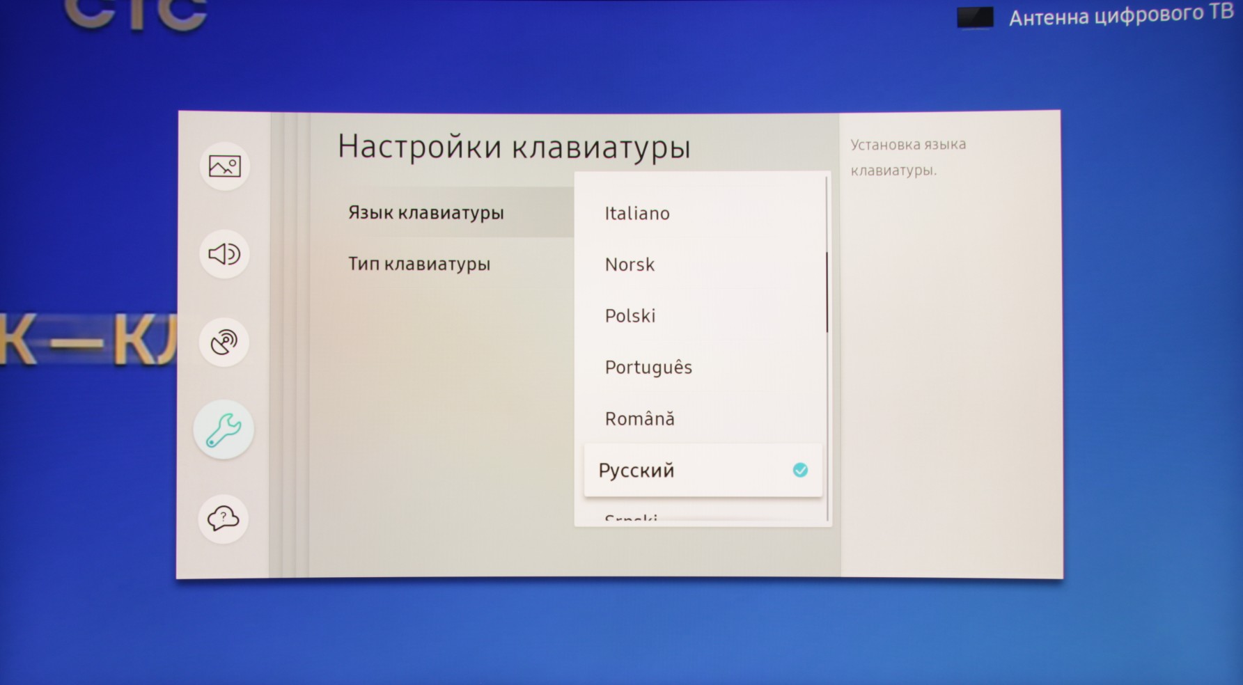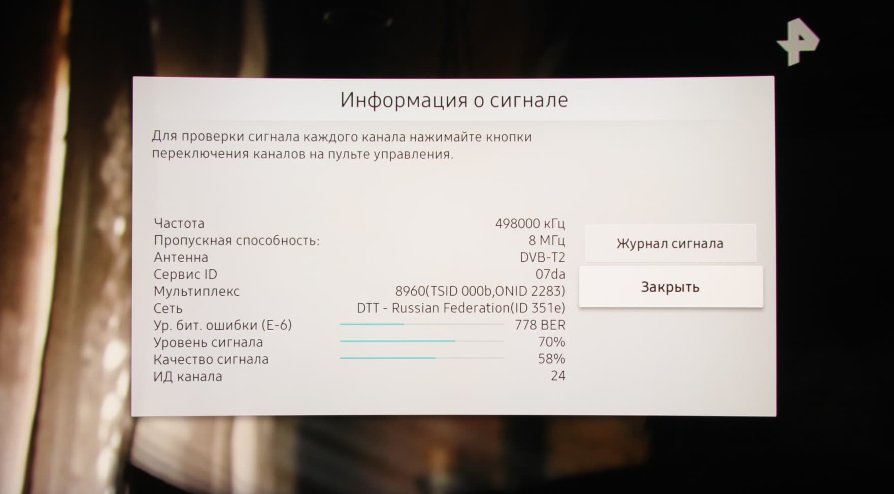 Данная модель, помимо спутникового тюнера, оснащена тюнером, принимающим аналоговый и цифровой сигнал эфирного и кабельного вещания. Качество приема цифровых каналов на комнатную антенну в нашем помещении и в случае данного ТВ было на высоком уровне, но потребовалось некоторое время, чтобы точно сориентировать антенну. Удалось обнаружить только 10 каналов во втором мультиплексе (РТРС-2 ТВК 24 (498 МГц)), но это скорее из-за особенности наших условий и используемой антенны.
