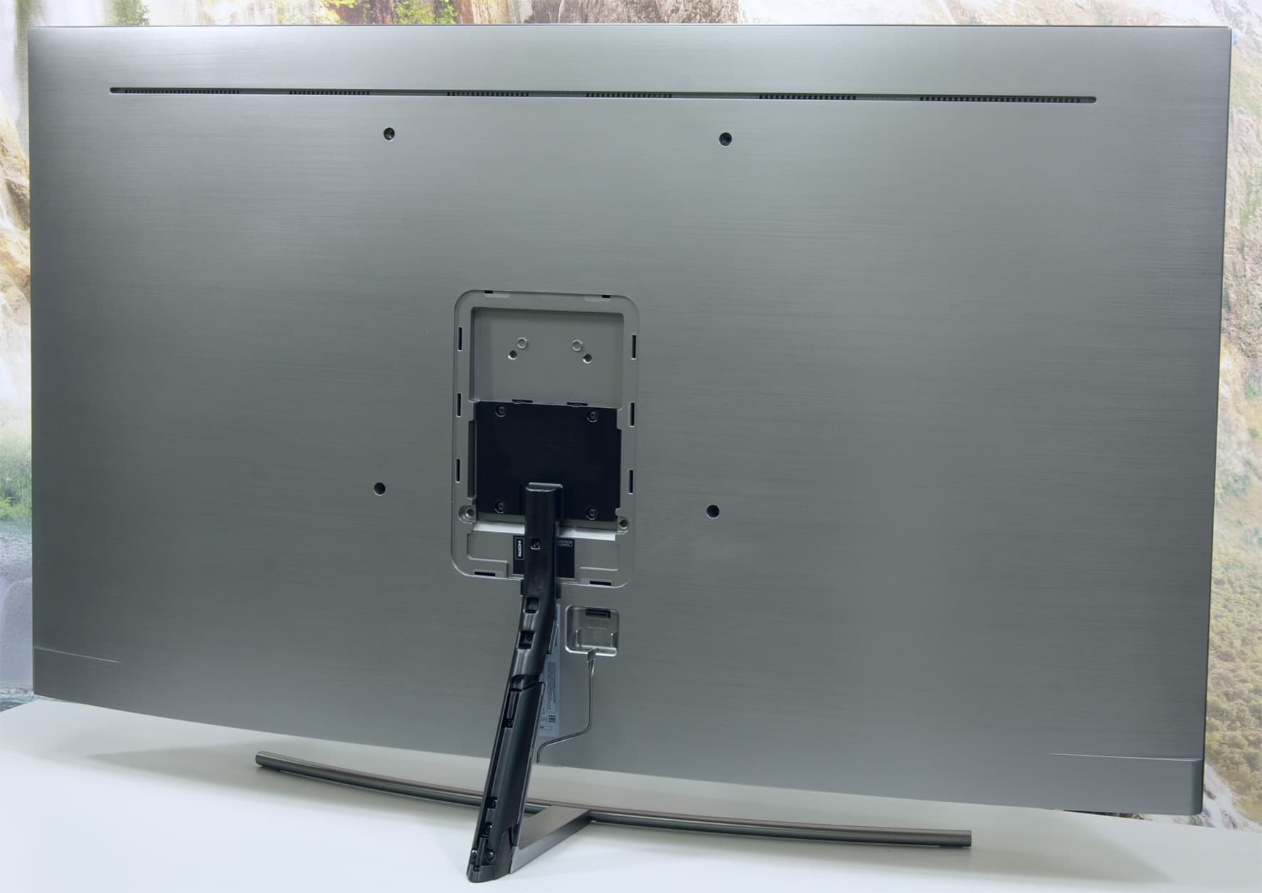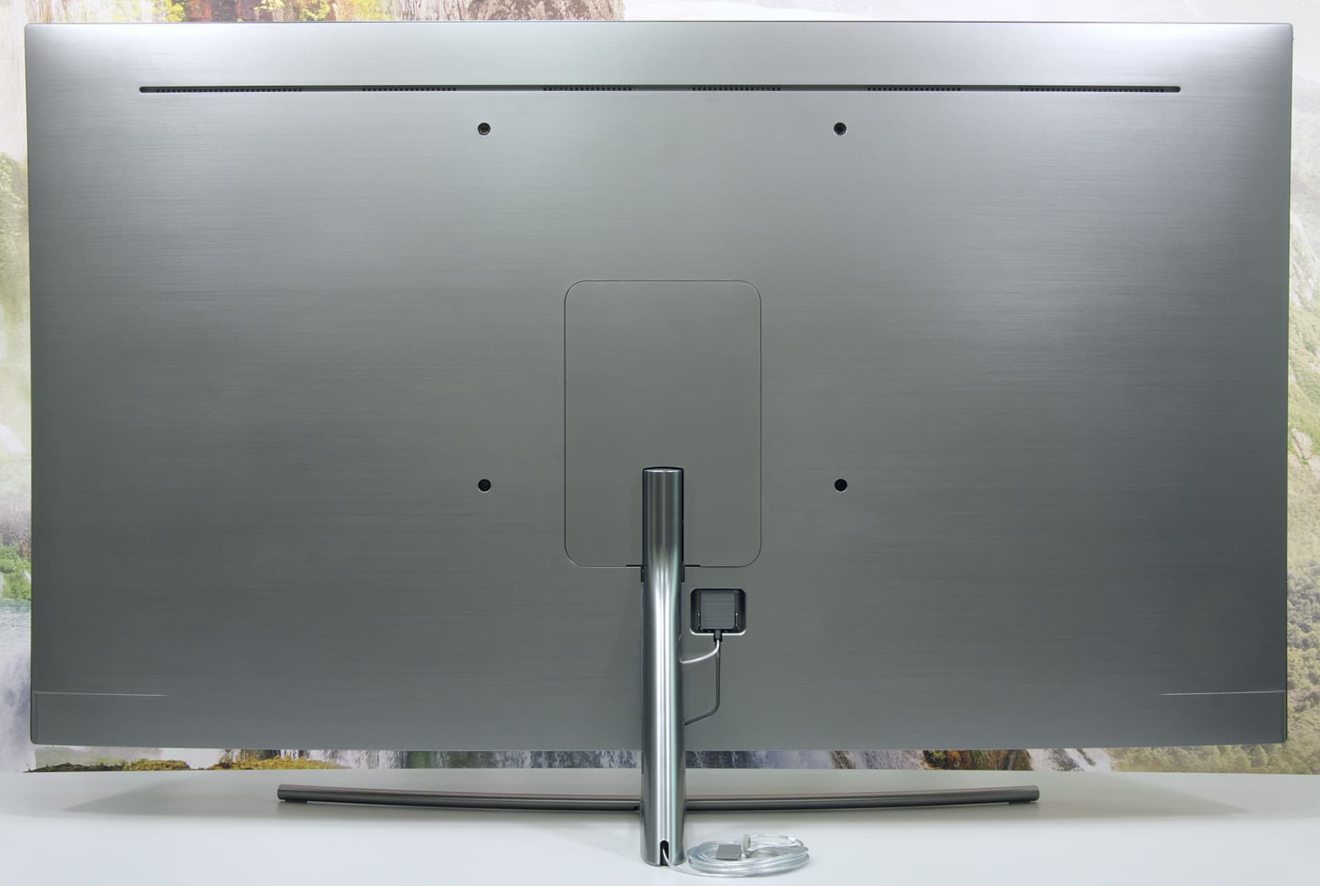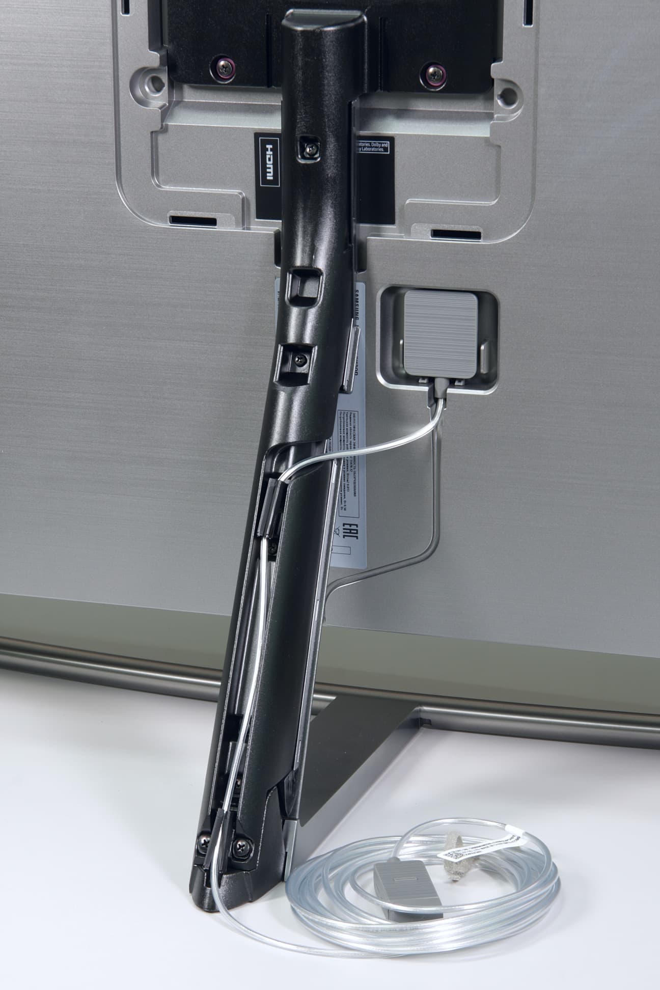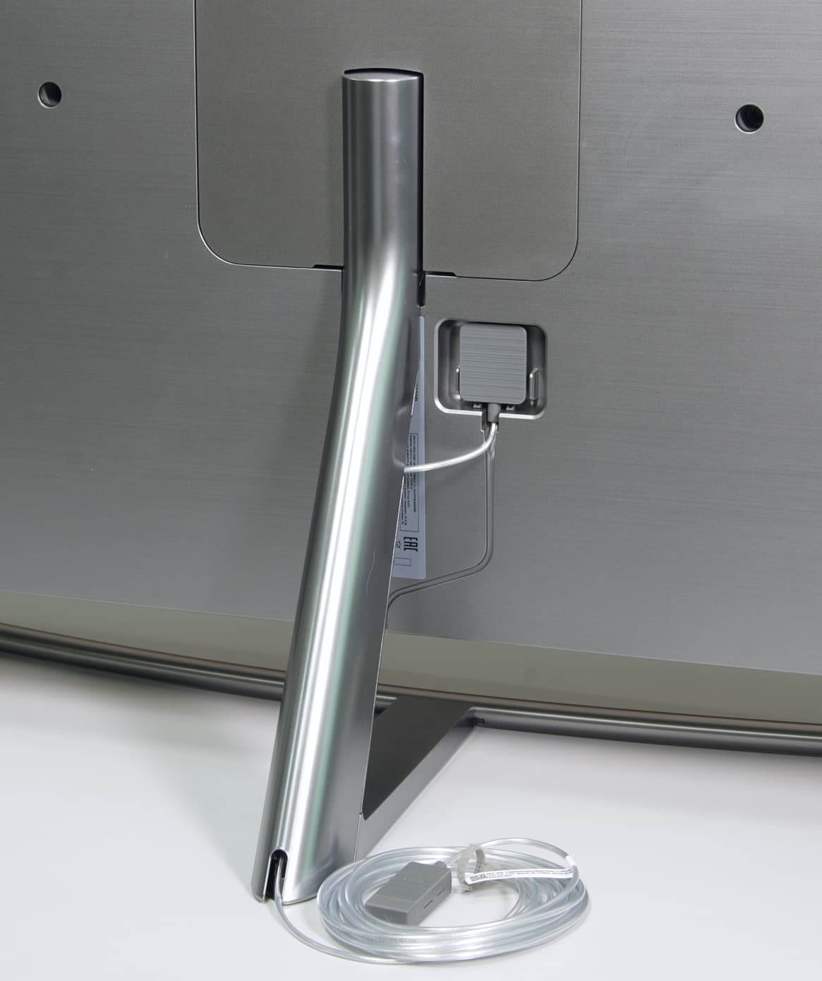 Стойка спереди и широкая прямая часть основания прикрыты щитками из пластика с серебристым покрытием. Разъем кабеля от модуля One Connect устанавливается в гнездо в неглубокой нише на задней панели. В случае настенного монтажа отходящий кабель укладывается в ложбинку на задней панели и выводится вниз. При использовании комплектной подставки кабель заводится в канал сзади на стойке.