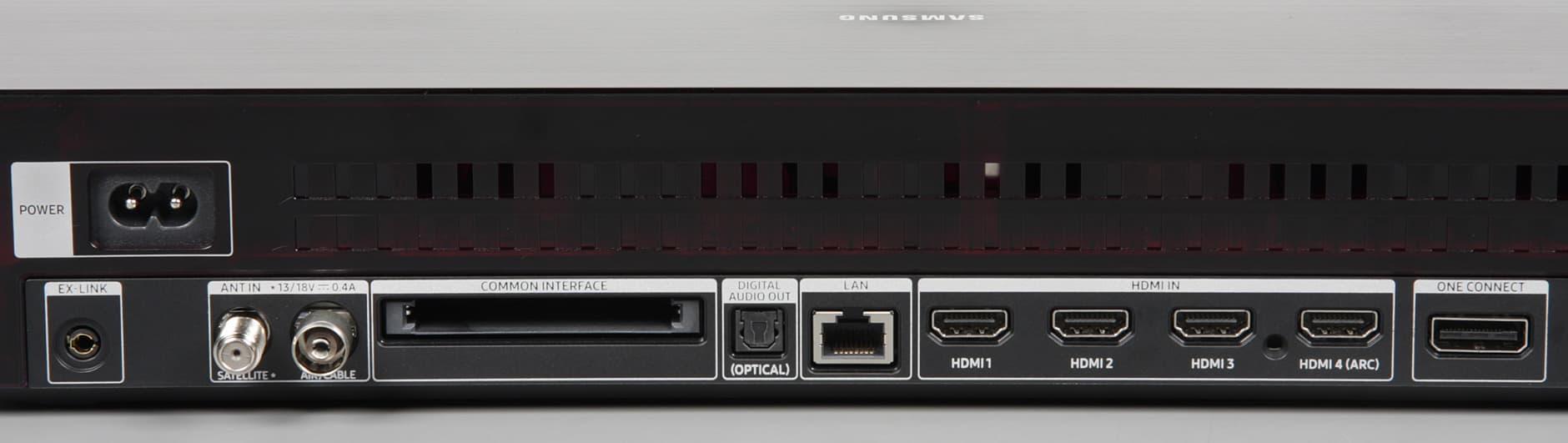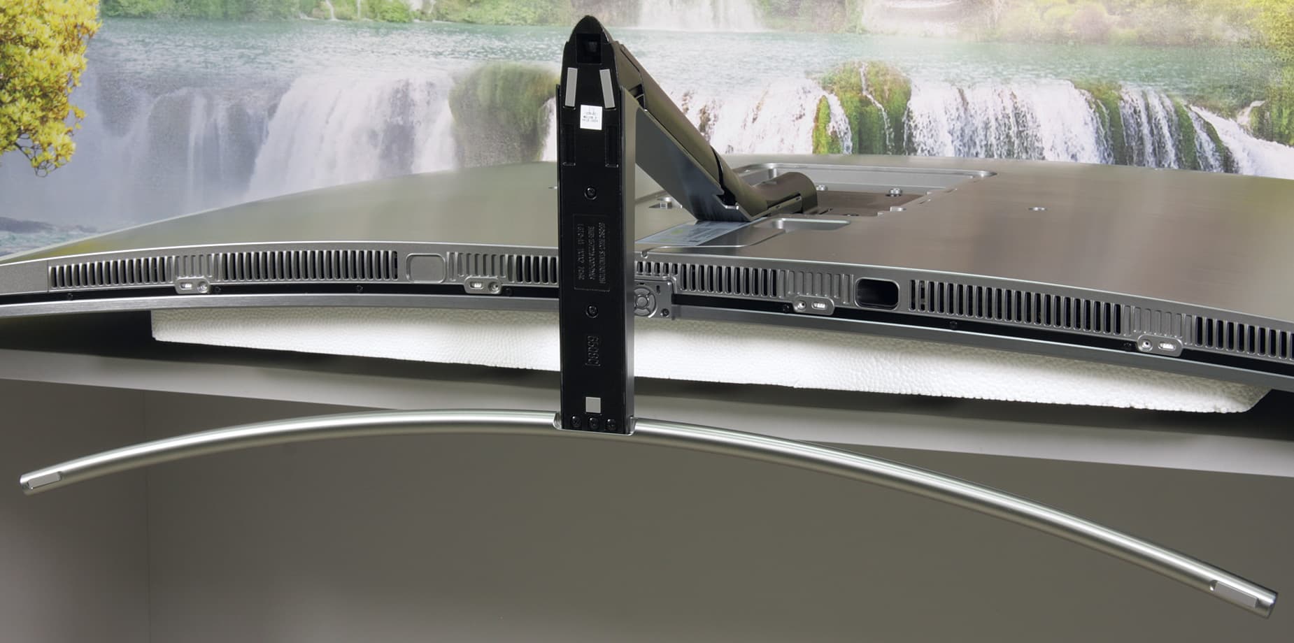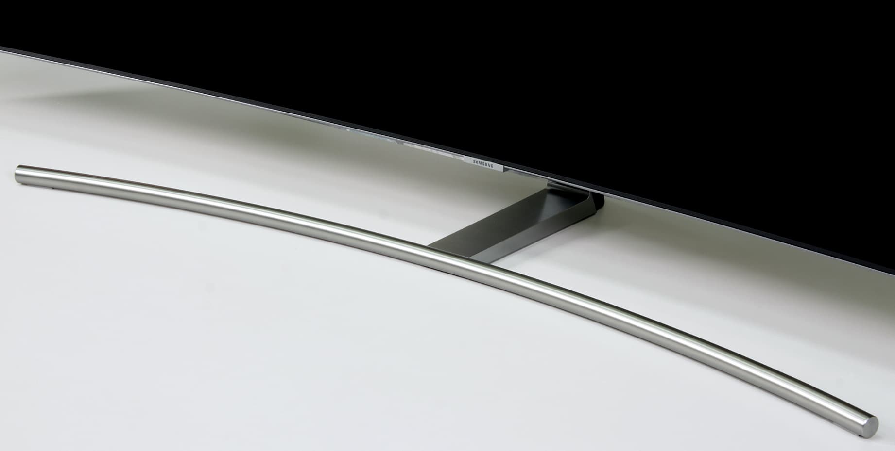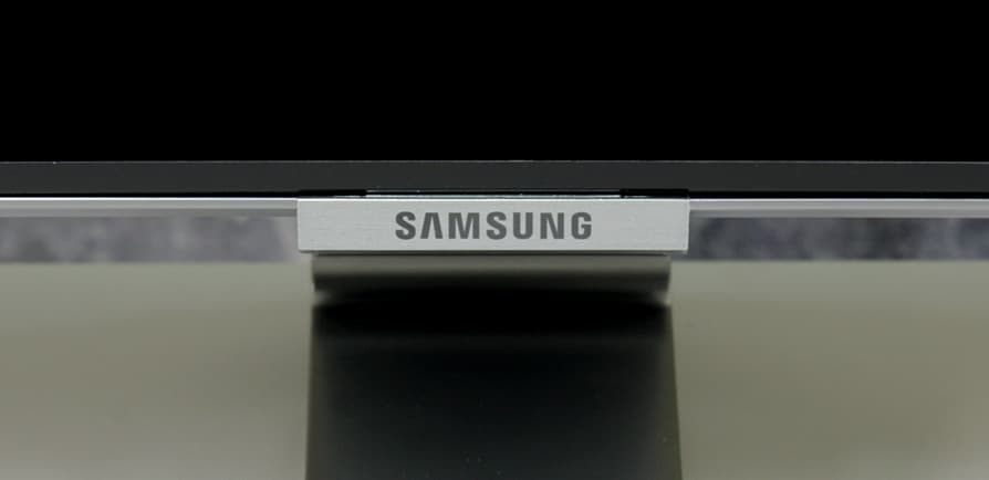 Стойка спереди и широкая прямая часть основания прикрыты щитками из пластика с серебристым покрытием. Разъем кабеля от модуля One Connect устанавливается в гнездо в неглубокой нише на задней панели. В случае настенного монтажа отходящий кабель укладывается в ложбинку на задней панели и выводится вниз. При использовании комплектной подставки кабель заводится в канал сзади на стойке.