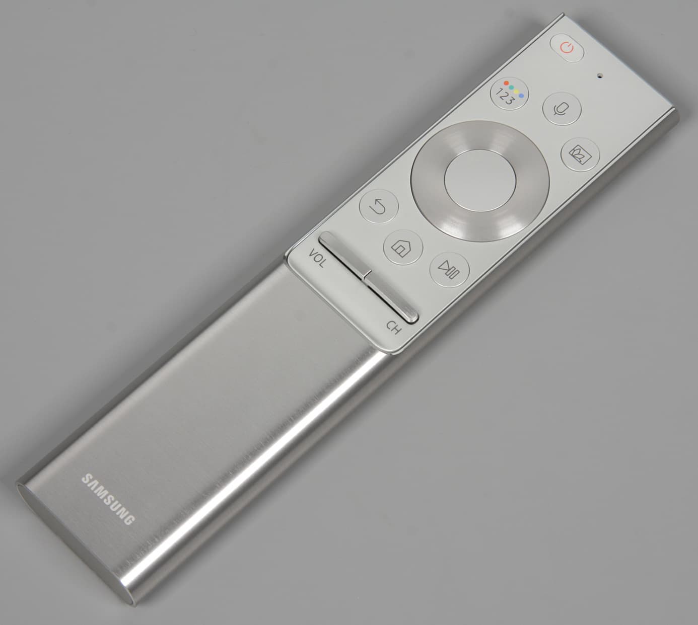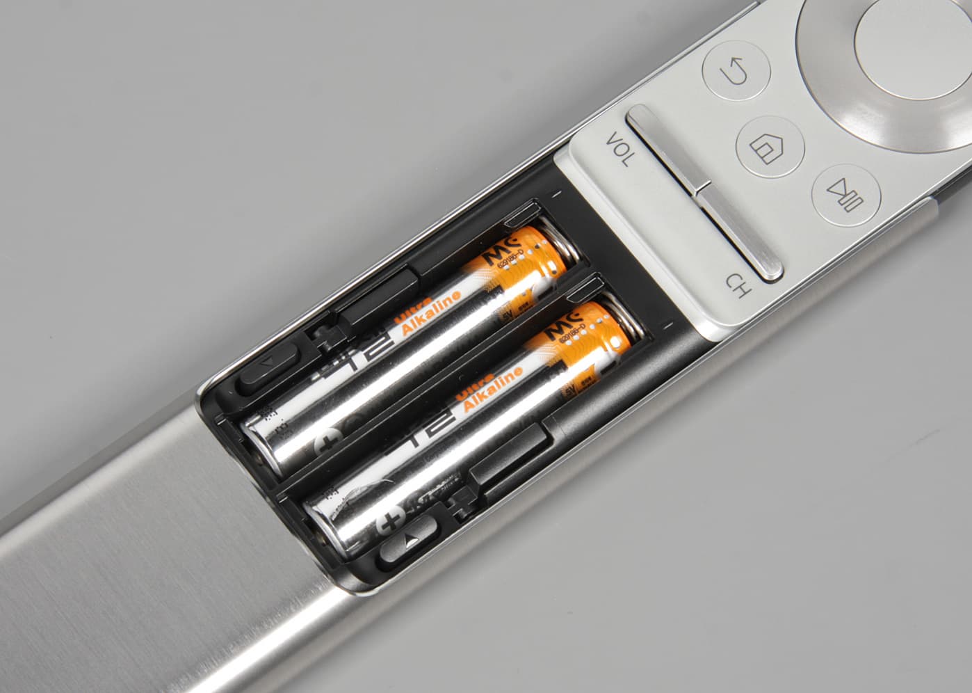 Пульт имеет оригинальную конструкцию. Нажав на кнопочку снизу, можно сдвинуть назад алюминиевый кожух.