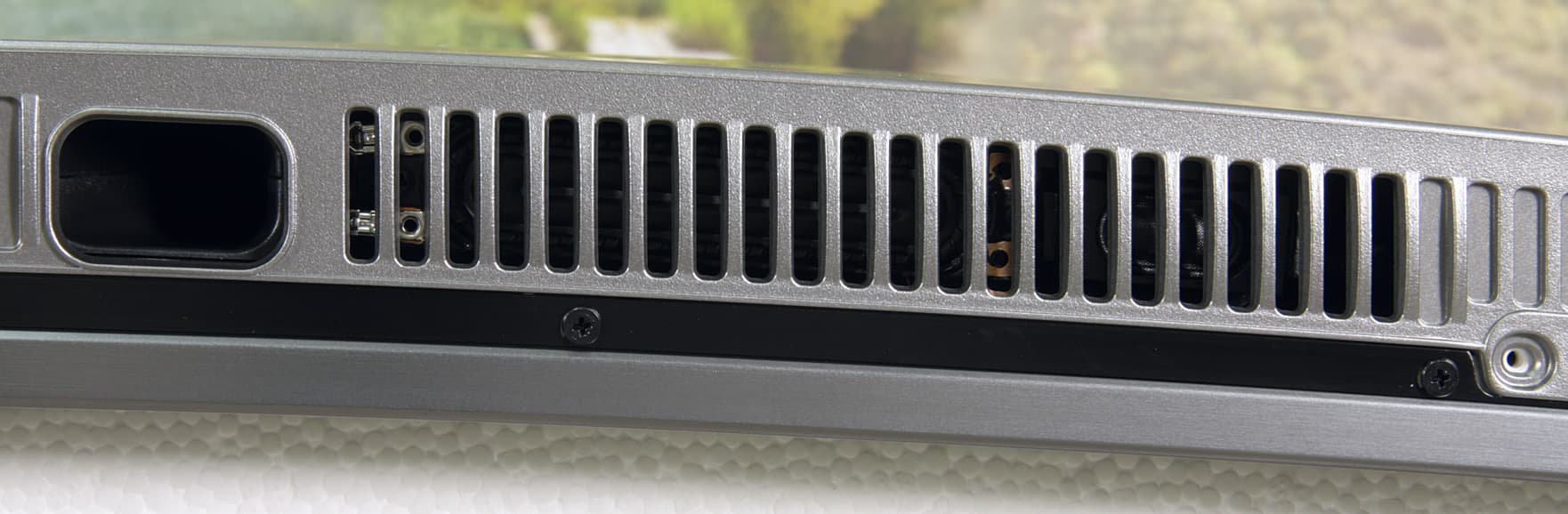 Телевизор имеет полностью пассивное охлаждение. За разнесенными от центра решетками на нижнем торце можно рассмотреть две пары (средне- и высокочастотные) громкоговорителей с вытянутыми диффузорами. Рядом с одной парой есть выходное отверстие рупора или фазоинвертора низкочастотного громкоговорителя